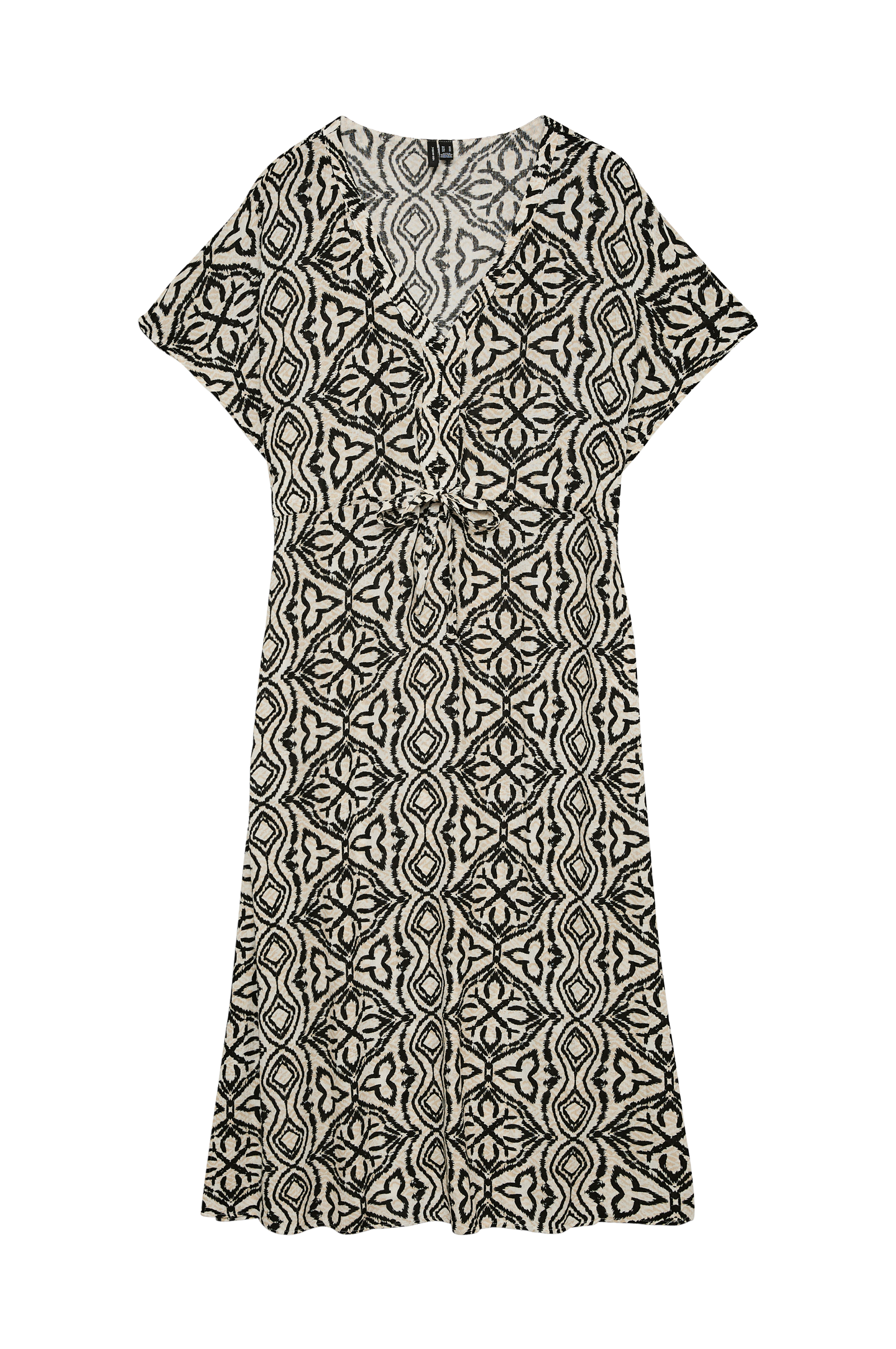 • Mønstret kjole i viskose• Kaftandesign• V-udskæring• Træksnørre ved taljen• Slidser nede i siderne• Længde: 129 cm i størrelse 44• Plusstørrelser