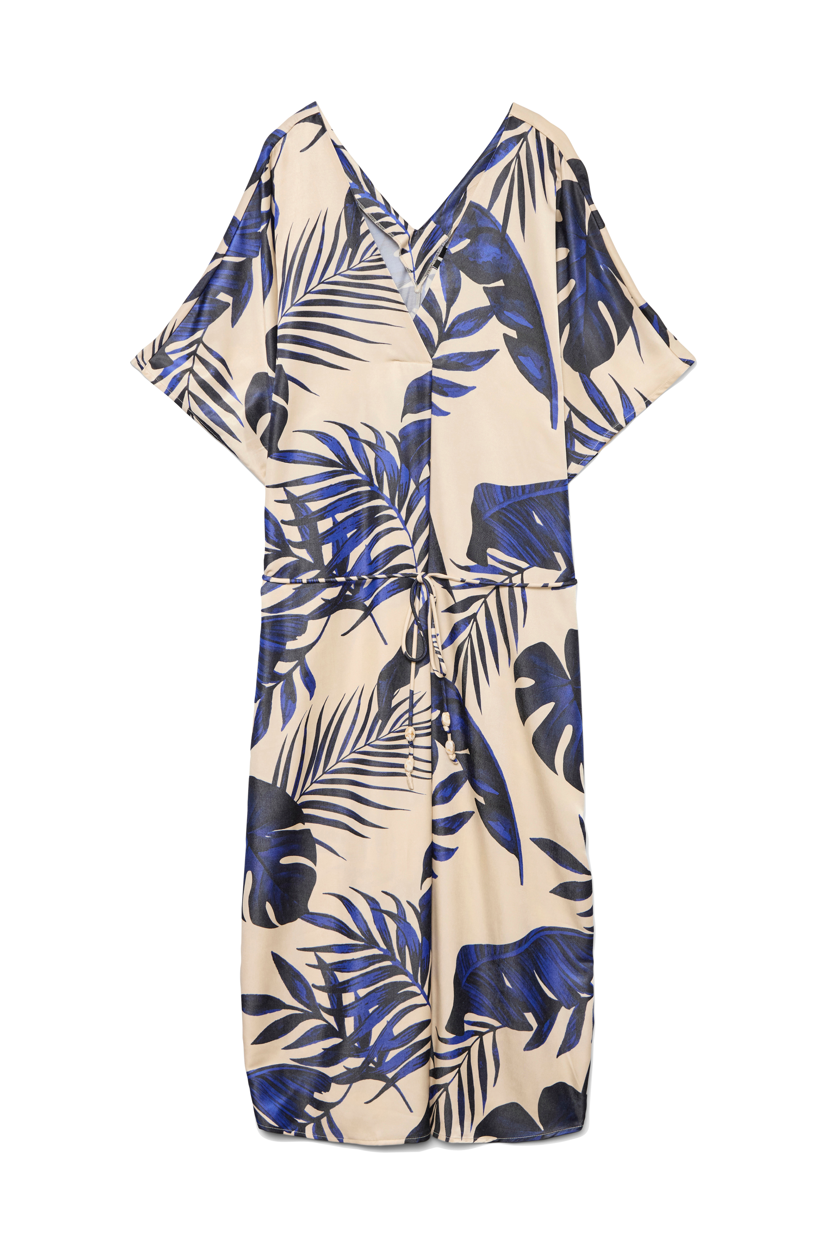 • Store størrelser• Bred, lige model• V-udskæring i halsen og i nakken• Nedsænket skulder med kort ærme• Fold på brystet• Tyndt bindebælte• Slids nede i siderne• Længde: 124 cm i størrelse 44