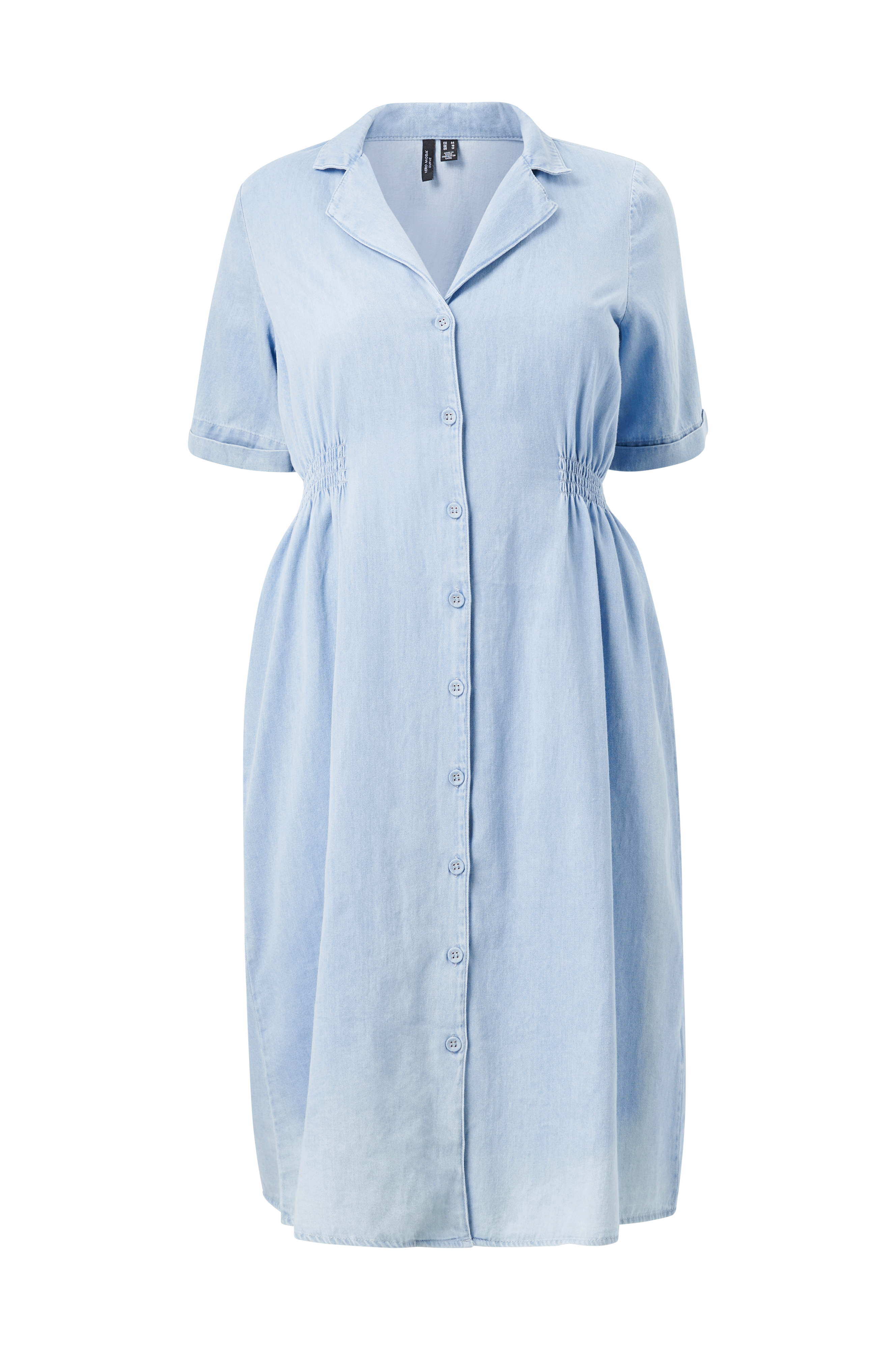 • Store størrelser• Figurformede model i blødt denim• Krave med revers• Knapstolpe hele vejen frem• Kort ærme med oprullet ved manchetterne• Længde: 117 cm i størrelse 44