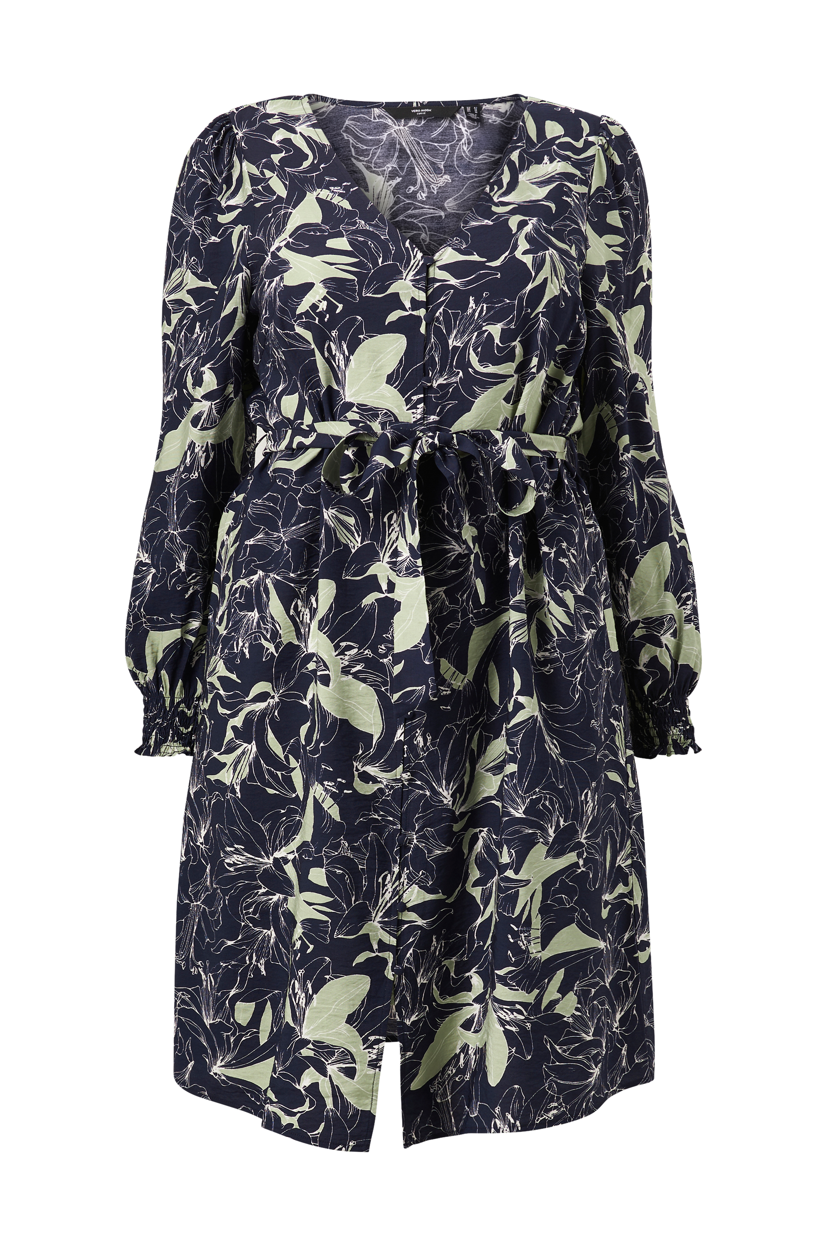 • V-udskæring• Knapper foran• Ballonærmer med smock ved manchetterne• Bindebælte ved taljen• Store størrelser• Længde: 108 cm i størrelse 42