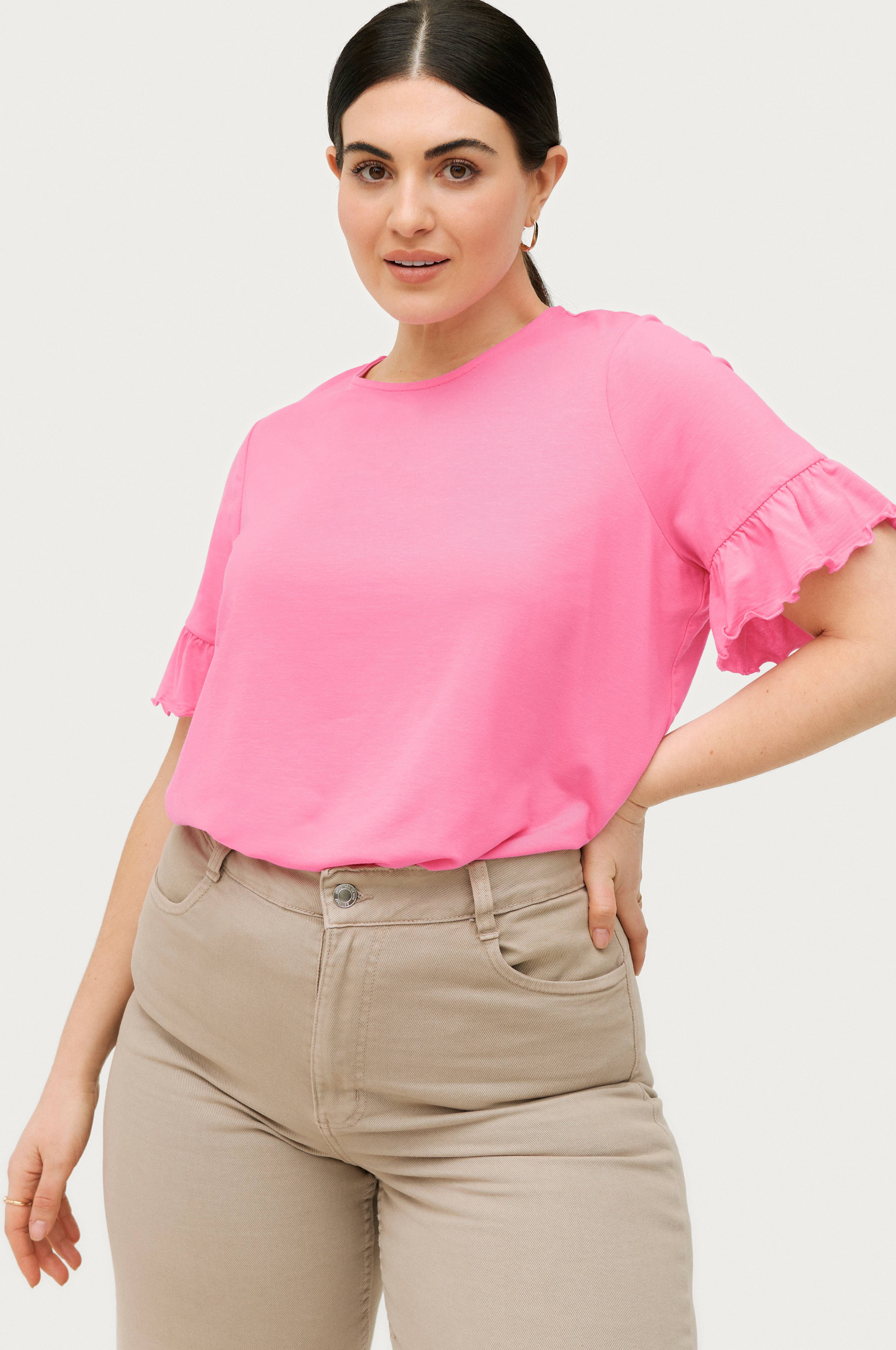 • Korte flagrende ærmer • Fremstillet af blød lyocell • Store størrelser • Produktet indeholder TENCEL™, som er et vedvarende materiale, og hvor fremstillingsprocessen sker i et lukket system, hvor alle ressourcer genanvendes og genbruges. TENCEL™ fremstilles af træsorter fra mere bæredygtige skovplantager. Det har lavere miljøpåvirkning og kræver mindre vand end bomuld.