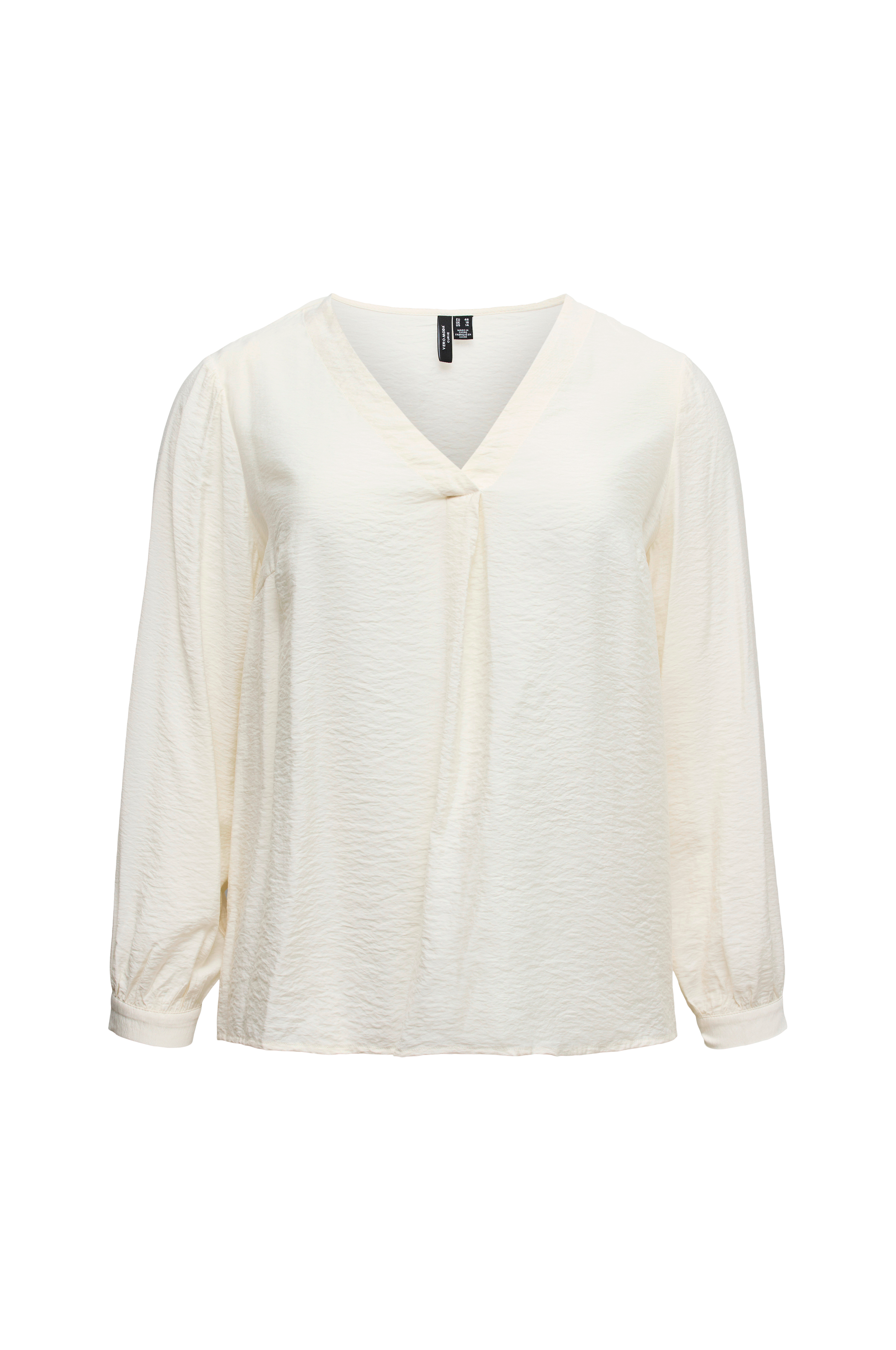 • Semitransparent top i let krøllet materiale• V-formet halsudskæring• Modfold foran• Lange ærmer• Tynde manchetter med knapper• Plusstørrelser