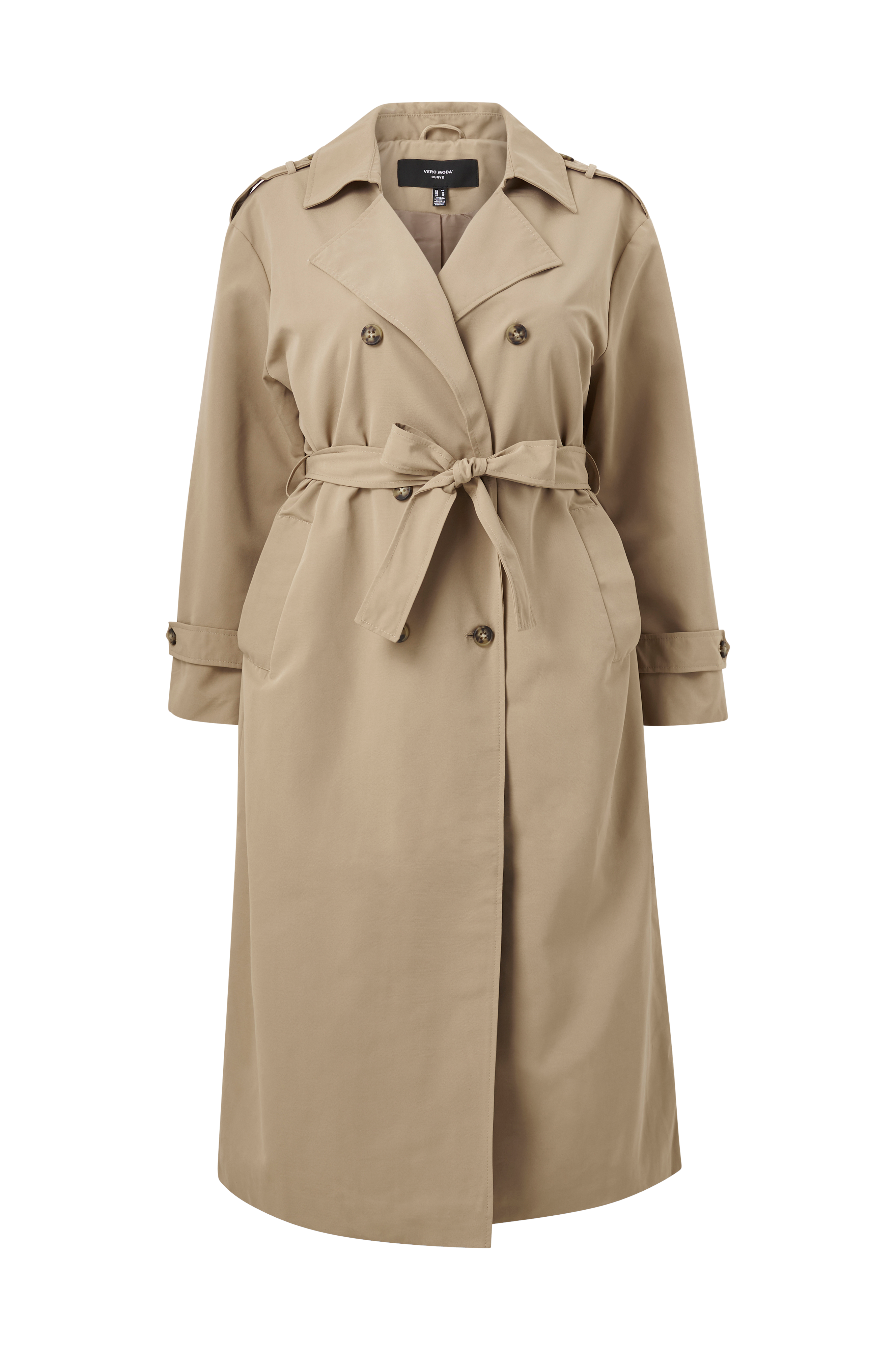 • Dobbeltbrystet model• Skulderstropper• To lommer• Knapdetalje ved manchetterne• Løstsiddende linning bagpå• Aftageligt bindebælte ved taljen• Slids nede bagved• Store størrelser• Længde: 130 cm i størrelse 44