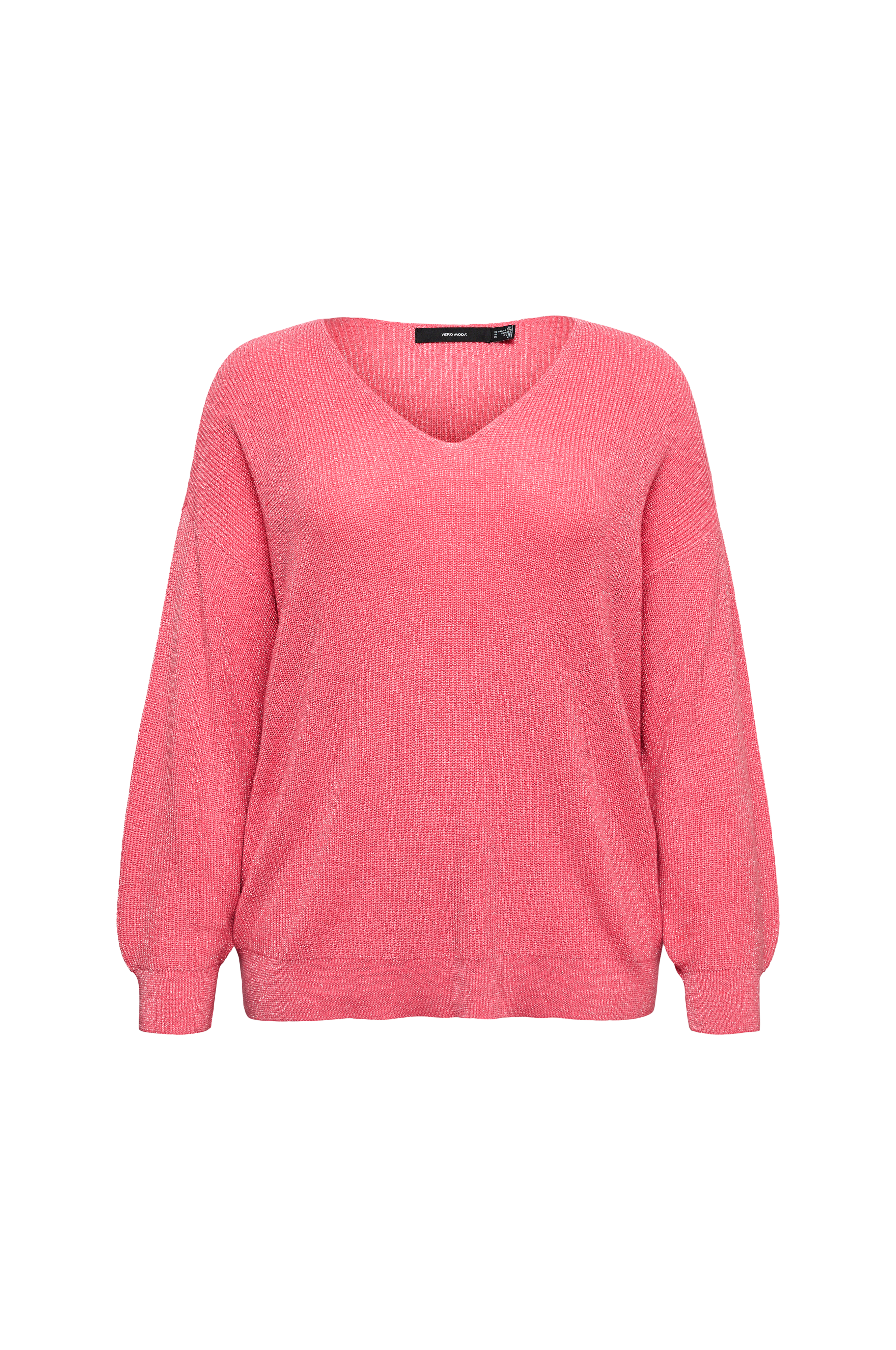• Strikket trøje med glimmertråd• V-formet halsudskæring• Lange ærmer• Ribstrik ved manchetterne og nederst• Store størrelser