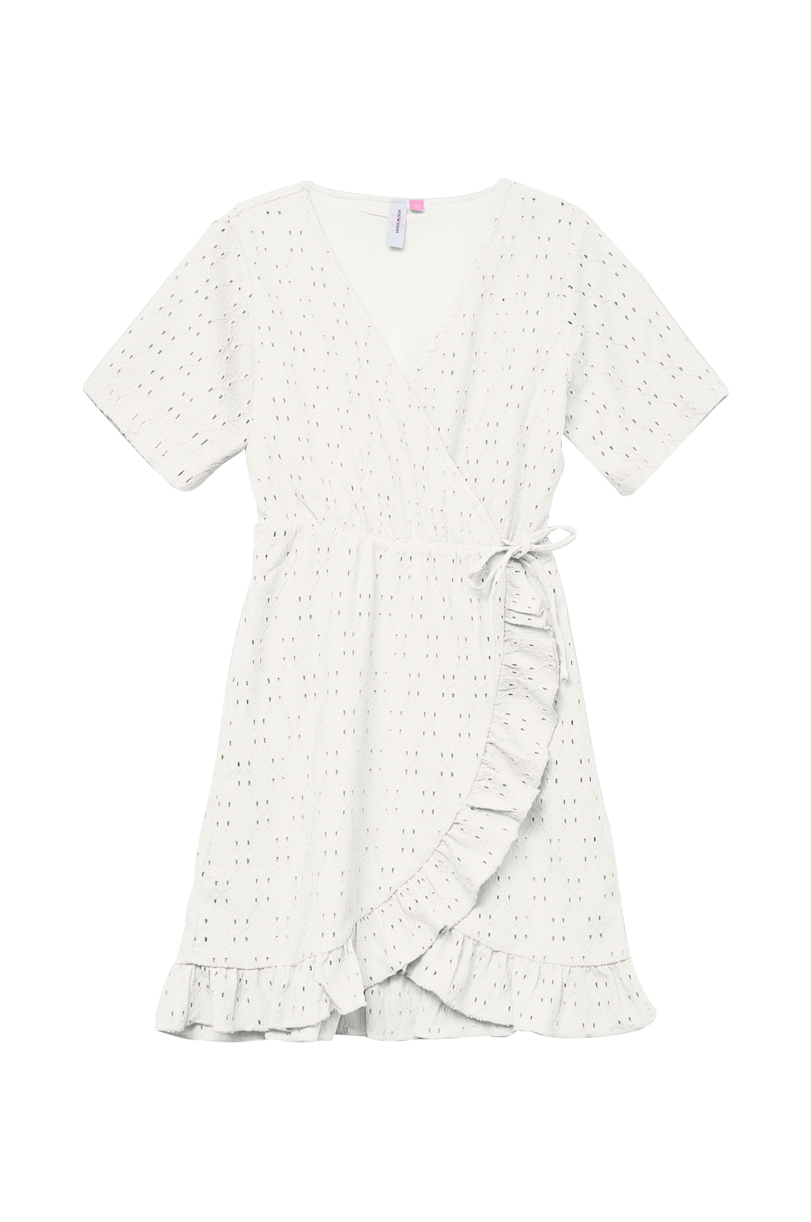 • Foret kjole med hulbroderier• Slå-om design på toppen• Kort ærme• Bindebånd i siden• Volanter på skørtet