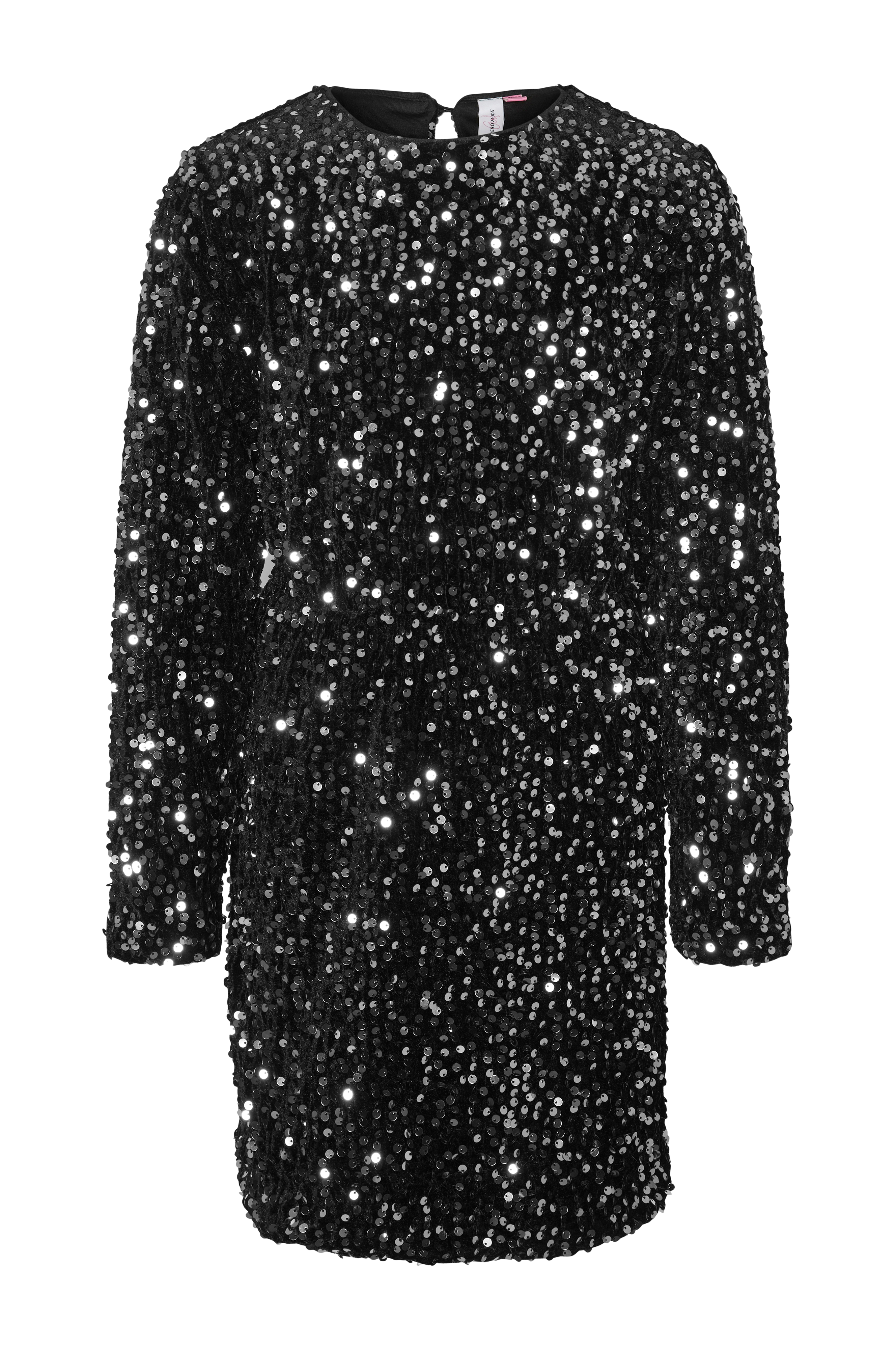 • Foret kjole med pailleter• Lige model• Rund halsudskæring• Ventilation med knap i nakken• Lange ærmer med tynd elastik ved manchetterne