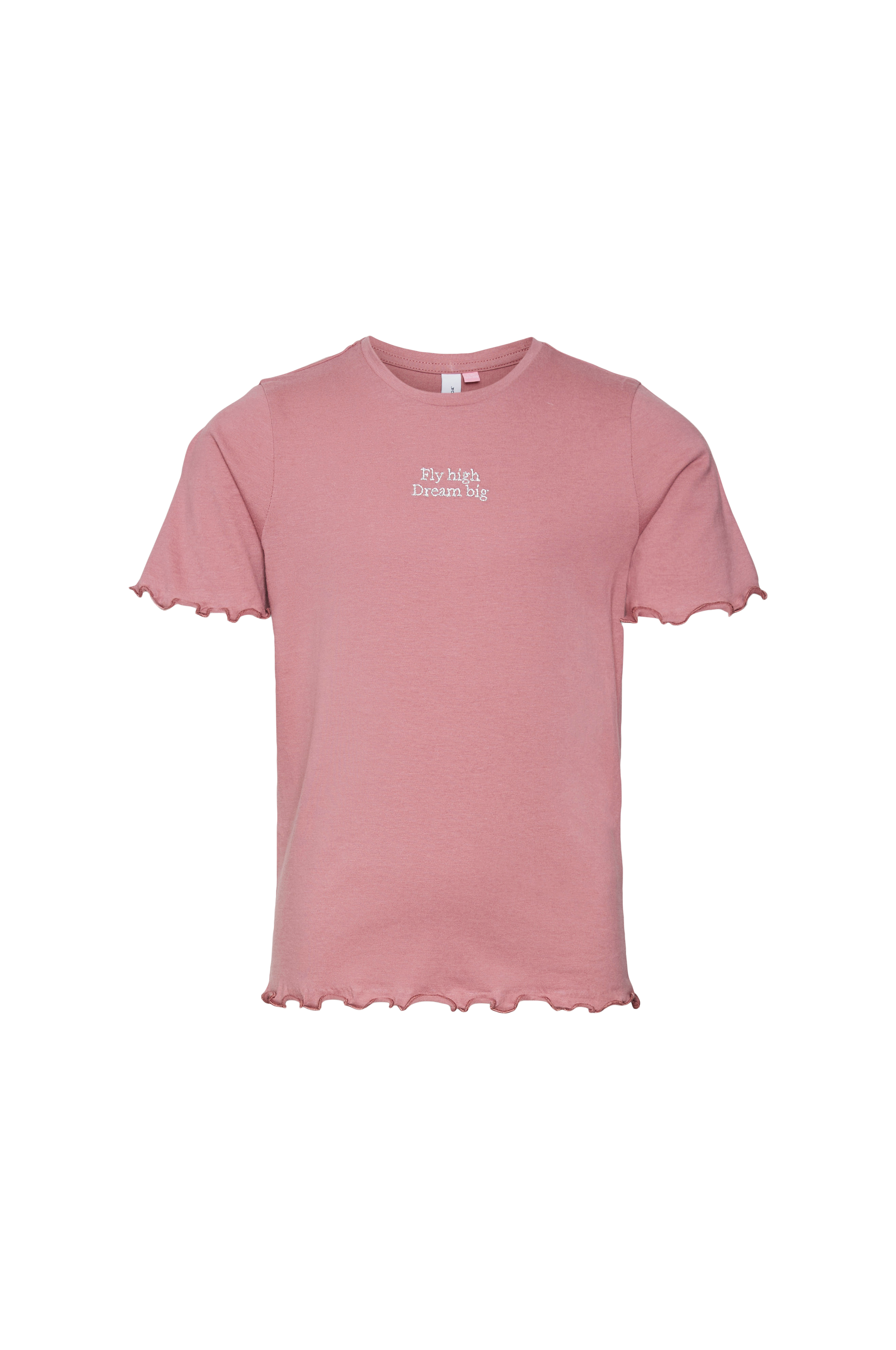 • Elastisk, blød top med broderet, glitrende tekst foran• Rund halsudskæring• Bølgede kanter ved manchetterne og nederst