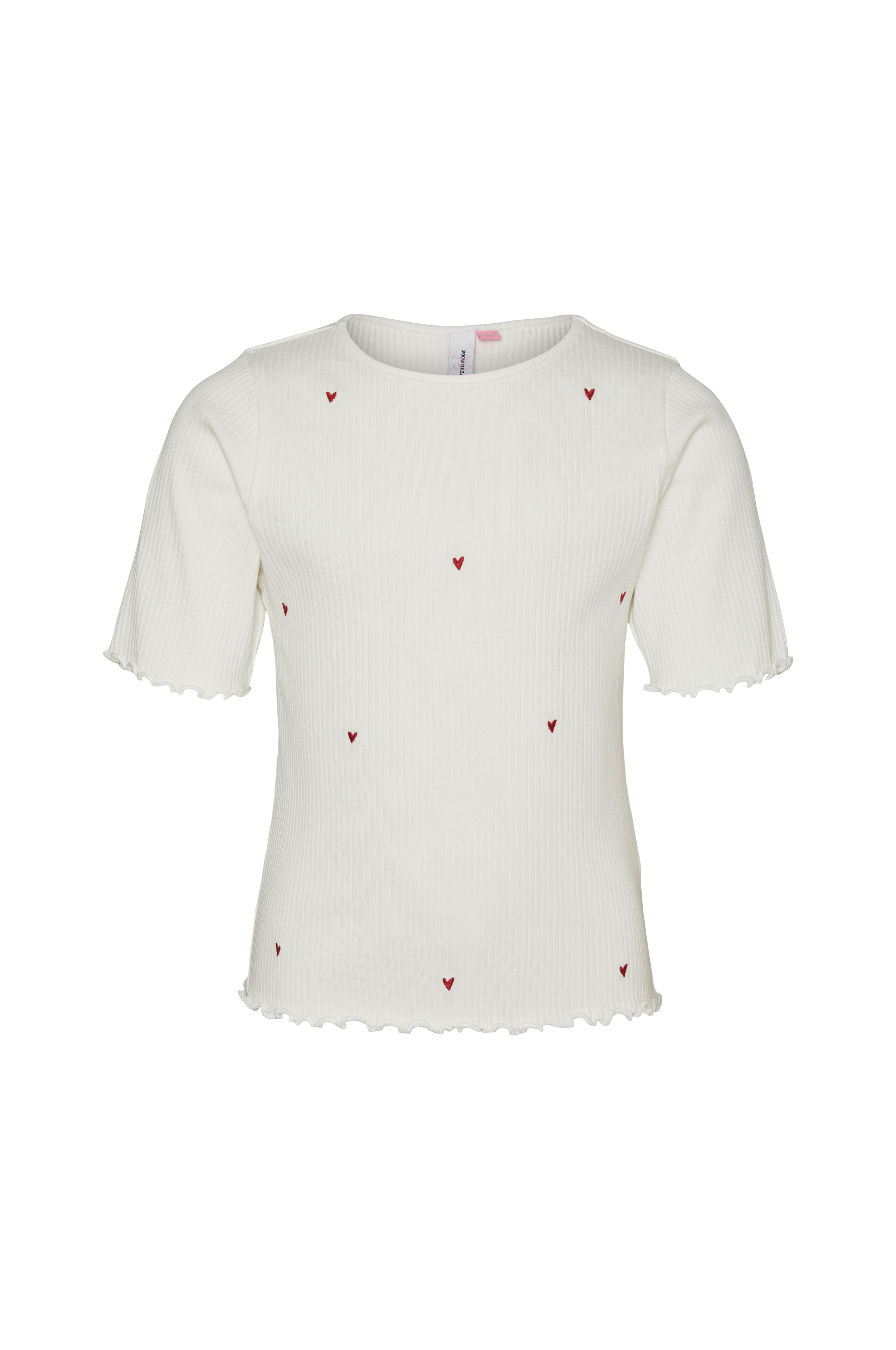 • Ribstrikket model med broderede hjerter foran• Rund hals• Kort ærme• Bølgede kanter ved manchetterne og nederst