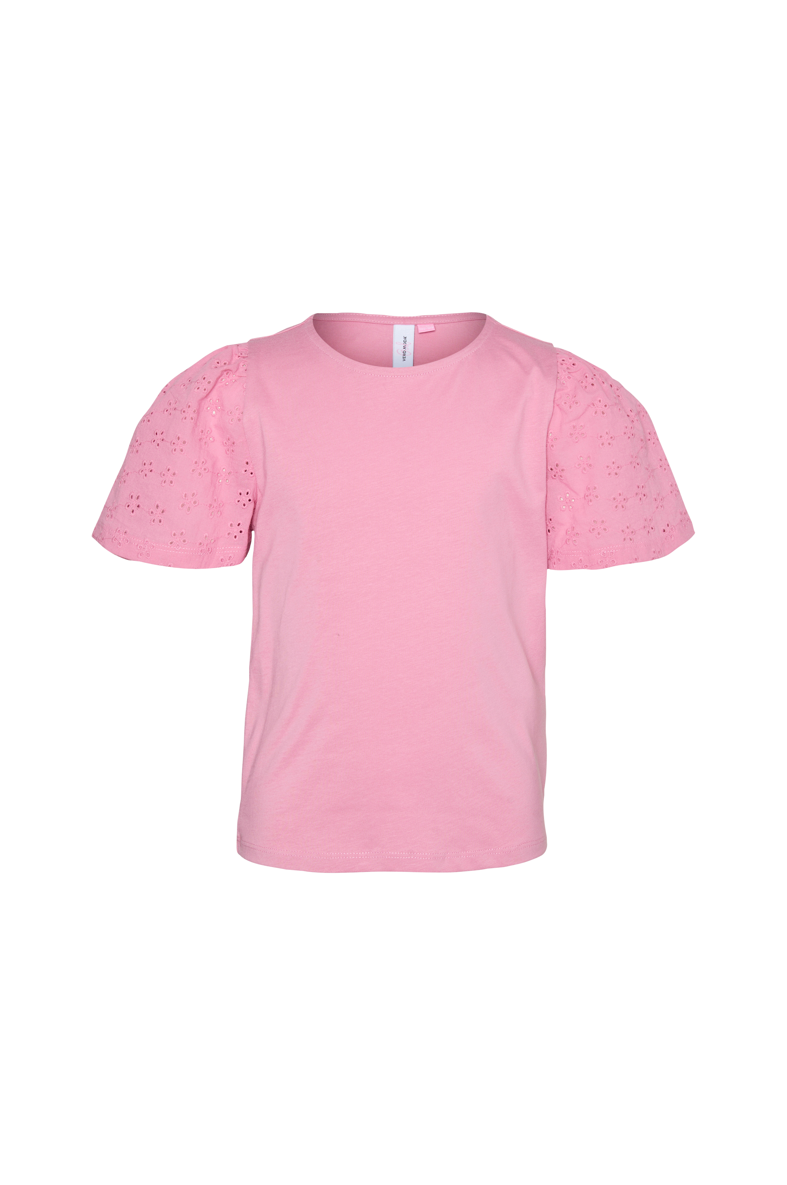 • Rund halsudskæring• Korte ærmer i vævet kvalitet med hulbroderier