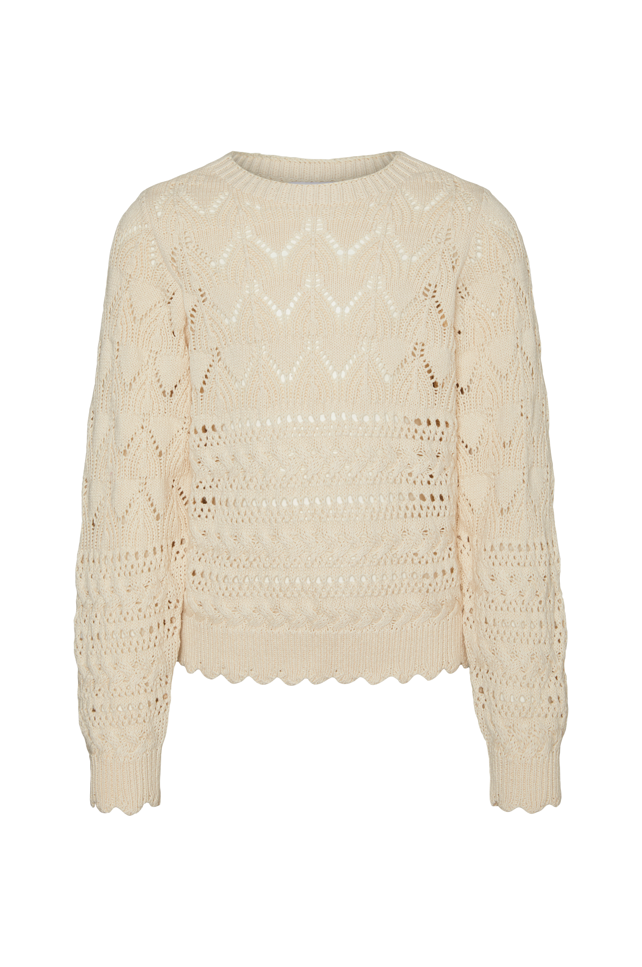 • Mønsterstrikket model• Rund hals med ribkant• Ribstrik med bølget kant nederst og ved manchetterne