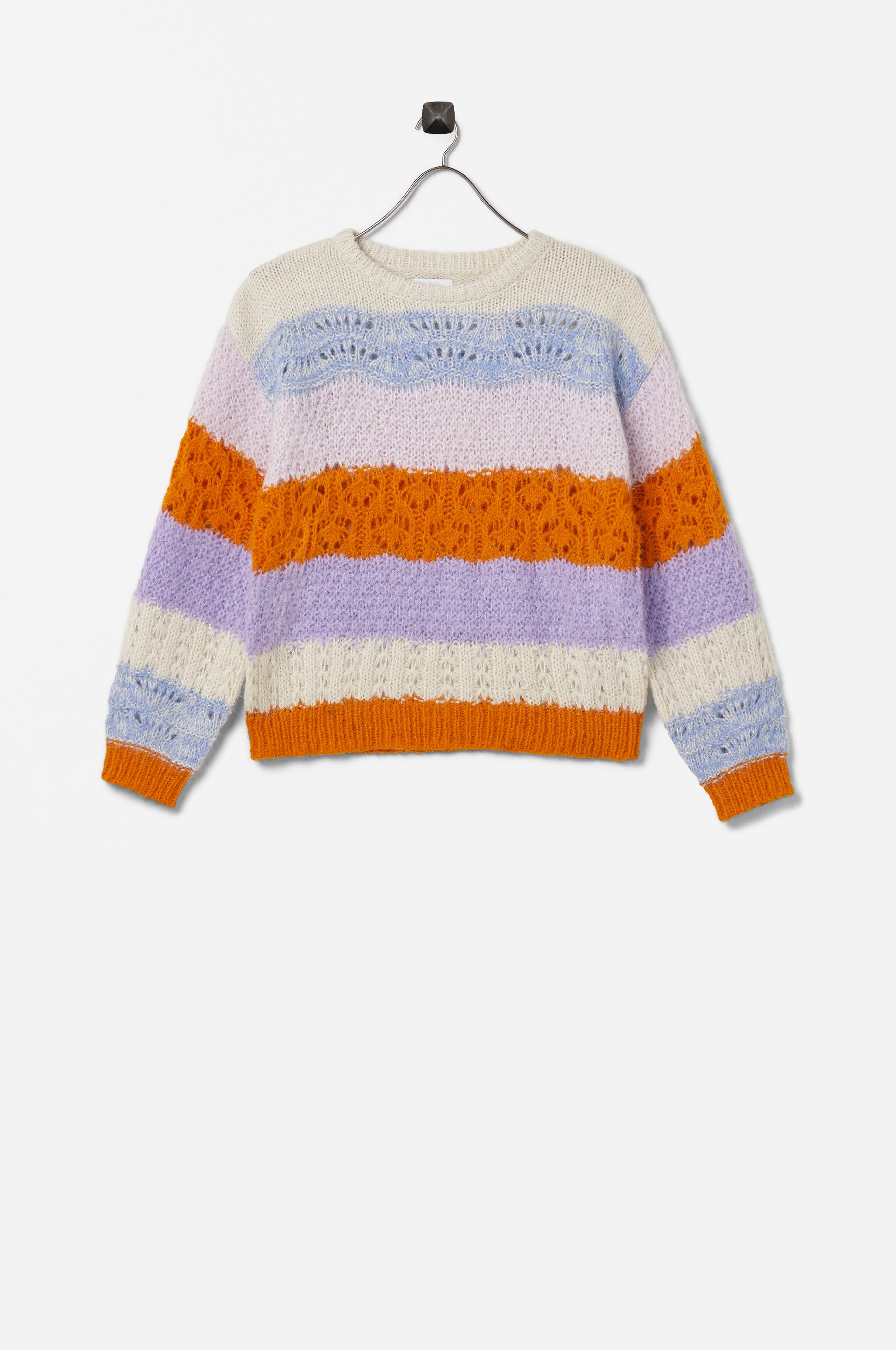 • Mønsterstrikning med hulmønster• Rund halsudskæring• Ribkanter ved ærmeafslutningerne og nederst• Produktet indeholder genindvundet materiale, som genbruges for at reducere mængden af affald samtidigt med at der ikke anvendes nye ressourcer.