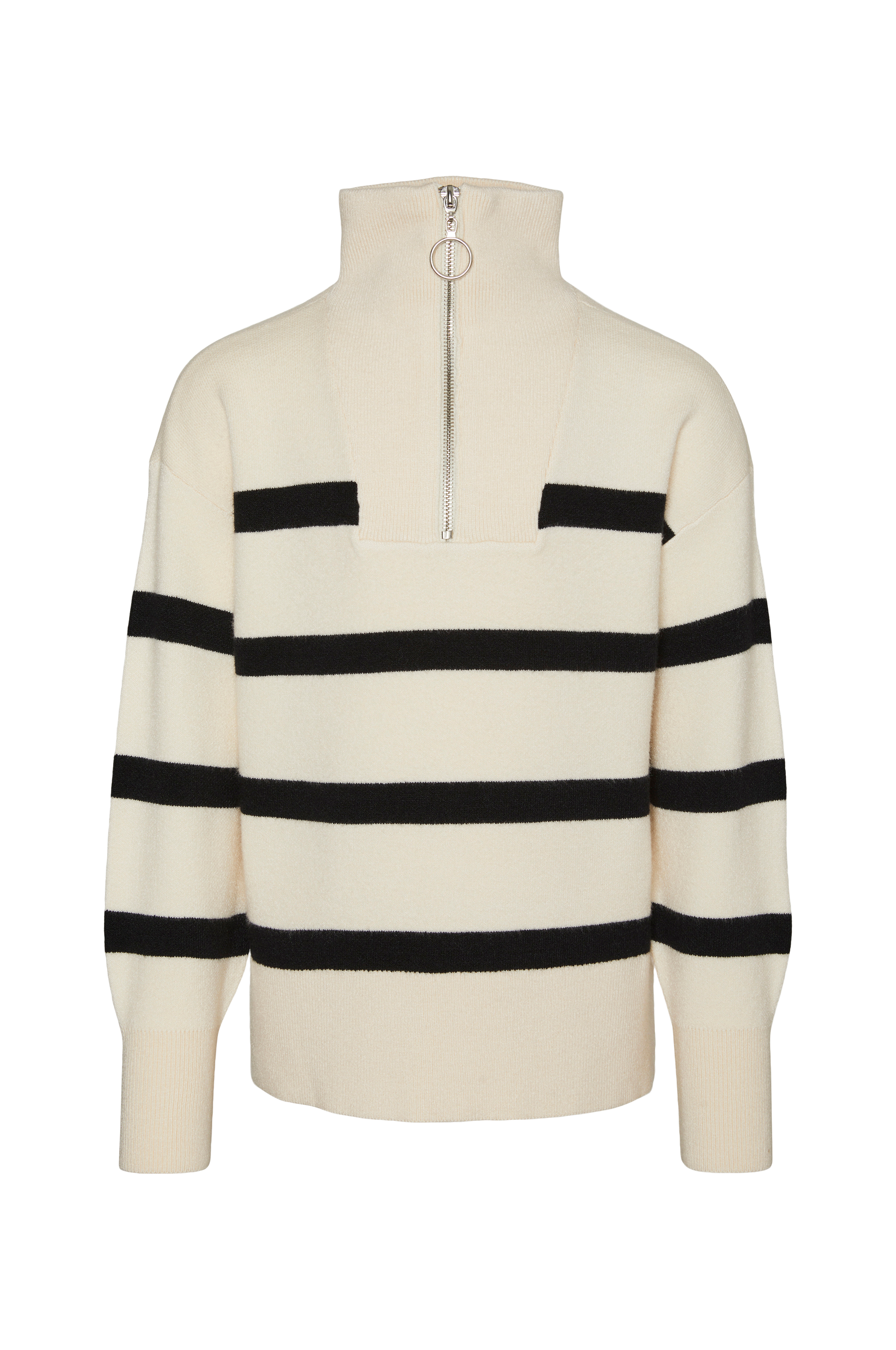 • Lige model med strikkede striber• Høj krave med lynlås• Bred ribstrik nederst og ved manchetterne