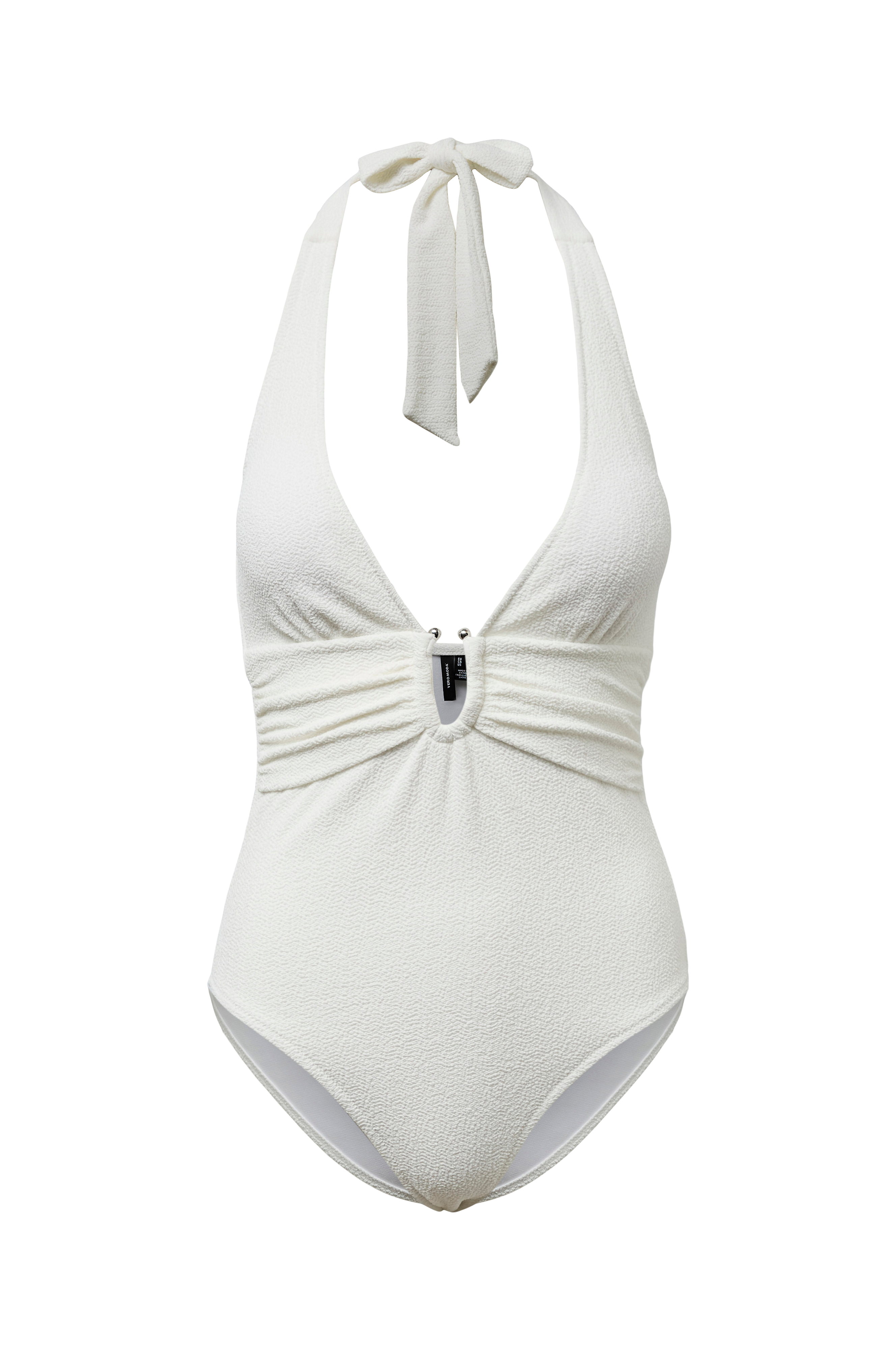 • Mønstervævet model• Drapering med sølvfarvet dekoration i metal på brystet• Trekantede skåle med aftagelig polstring• Halterneck med lange bindebånd i nakken• Helt foret