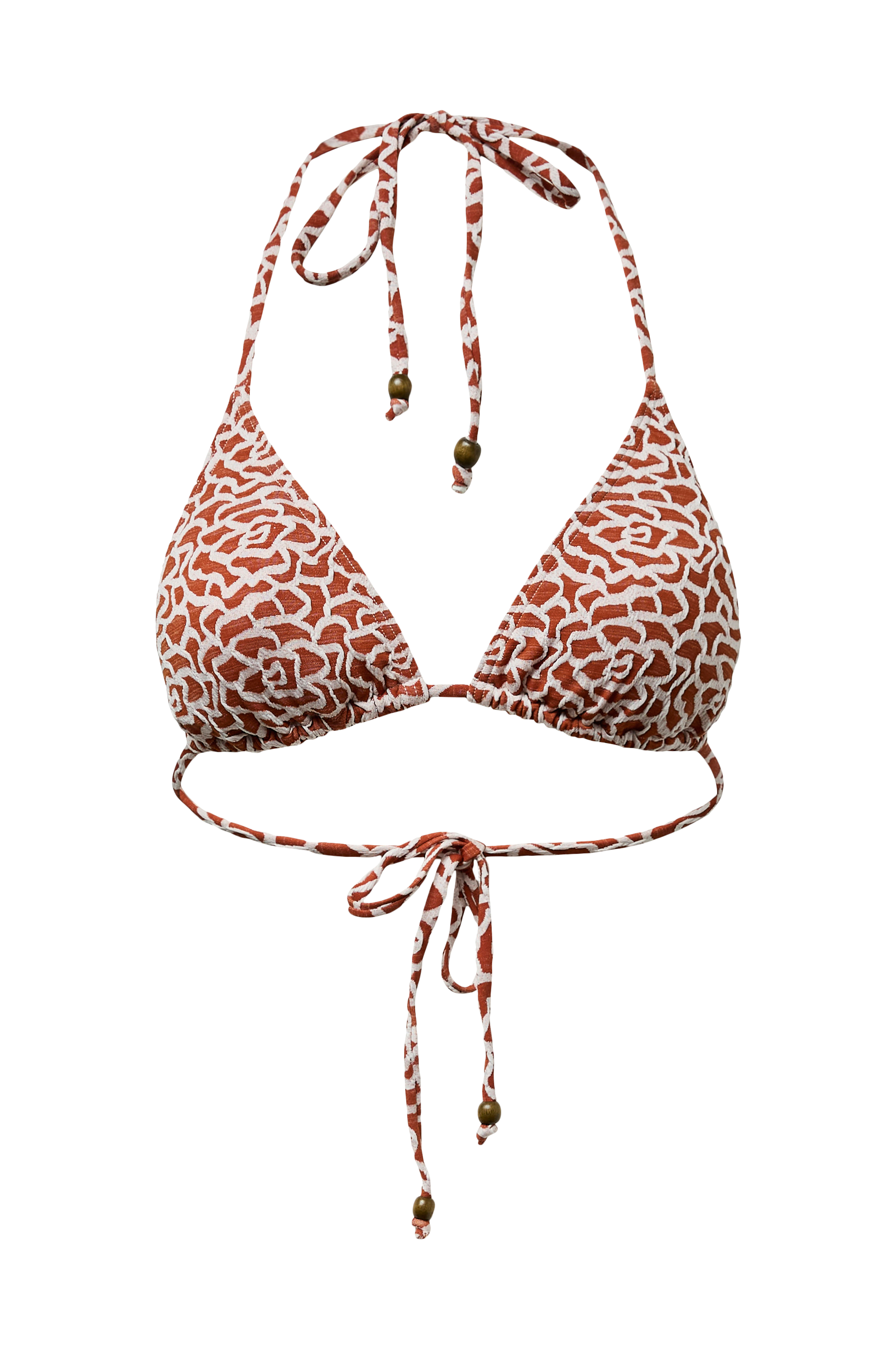 • Bikini-bh i polyestermix med mønstret struktur• Justérbare bindebånd i ryggen og i nakken med dekorative detaljer• Trekantet skål med aftagelig, let polstring
