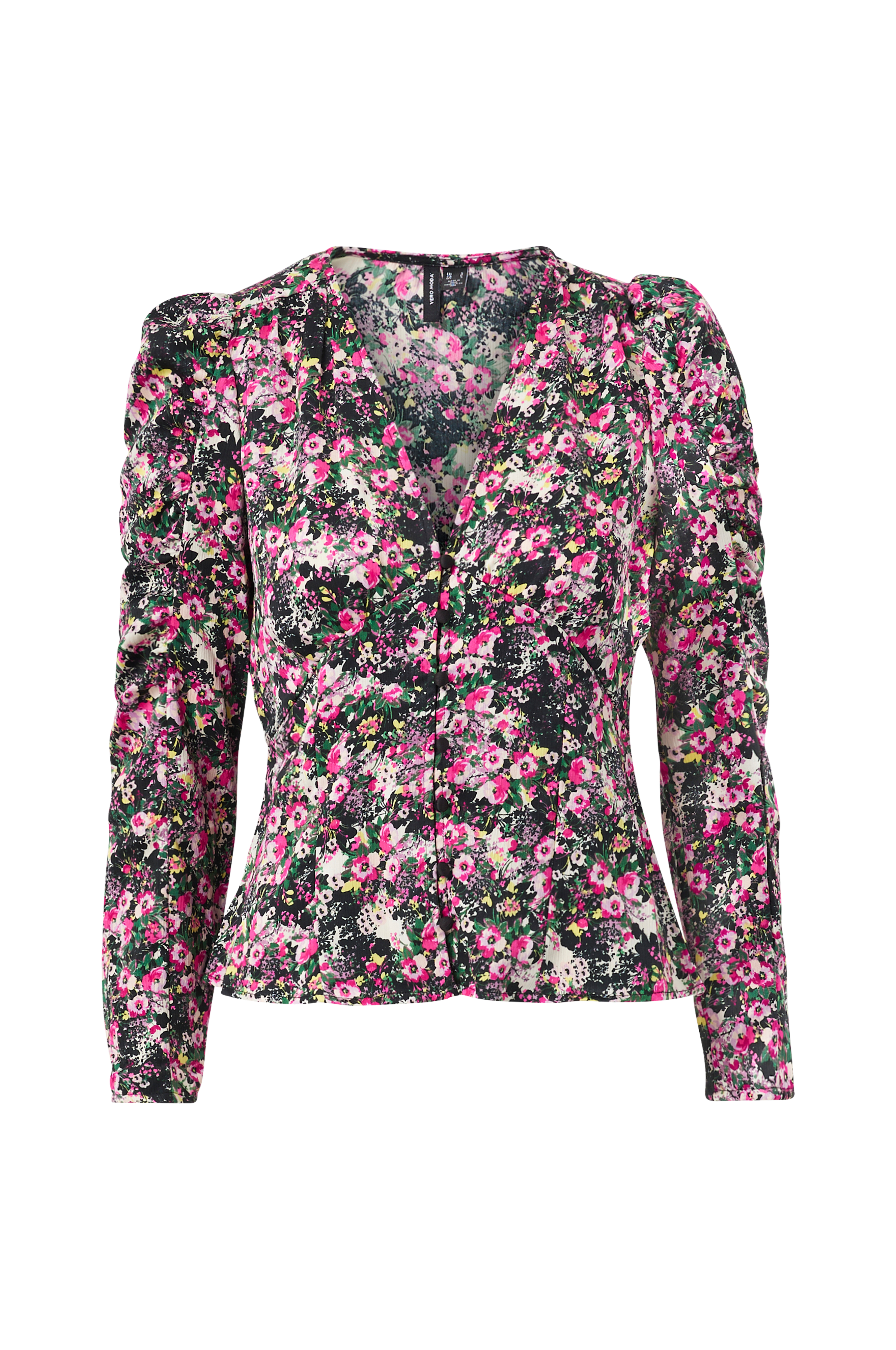 Bluse vmAnneline L/S Detail Top fra Vero Moda i let figursyet model med V-udskæring og betrukne knapper foran og rynket søm ved brystet. Lange ærmer med puf og rynkning foroven.