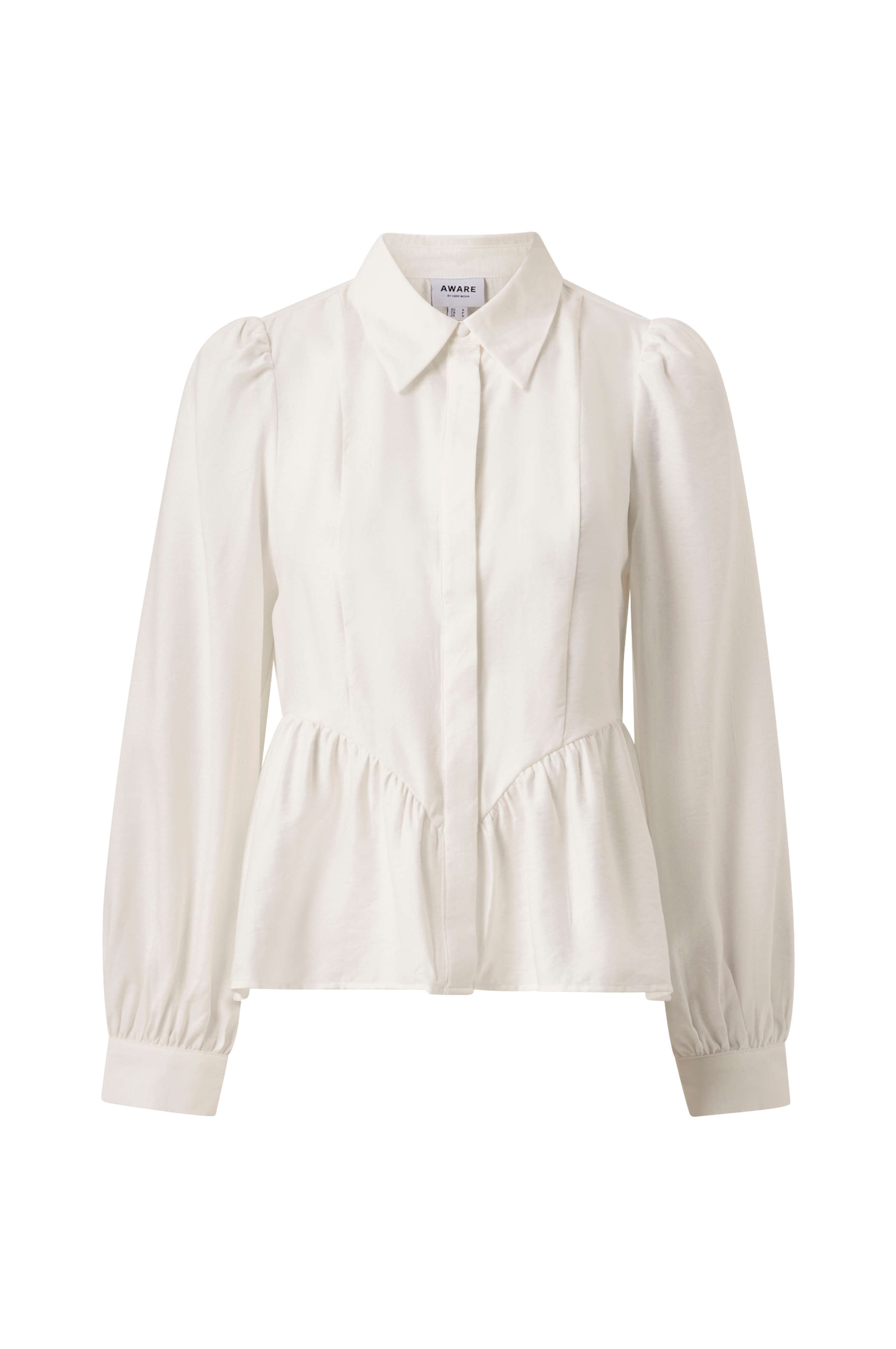 Bluse med skjulte knapper foran og dekorativt peplum-snit med flæse forneden. Noget videre ærmer med rynkning på skuldrene og manchet i ærmekant. Kvalitet med glans.