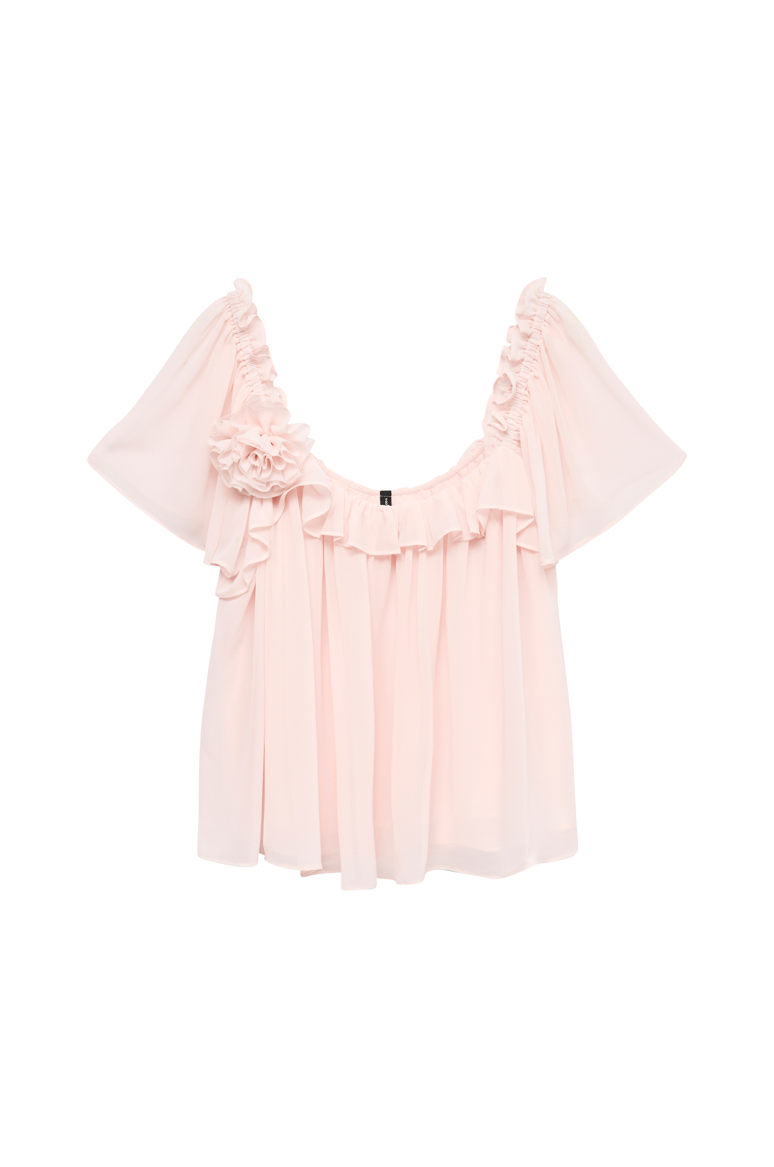 • Bluse i chiffon med inderfor i chiffon• Firkantet halsudskæring• Korte, uforede flagrende ærmer med elastik ved skuldrene• Dekorativ, aftagelig blomst