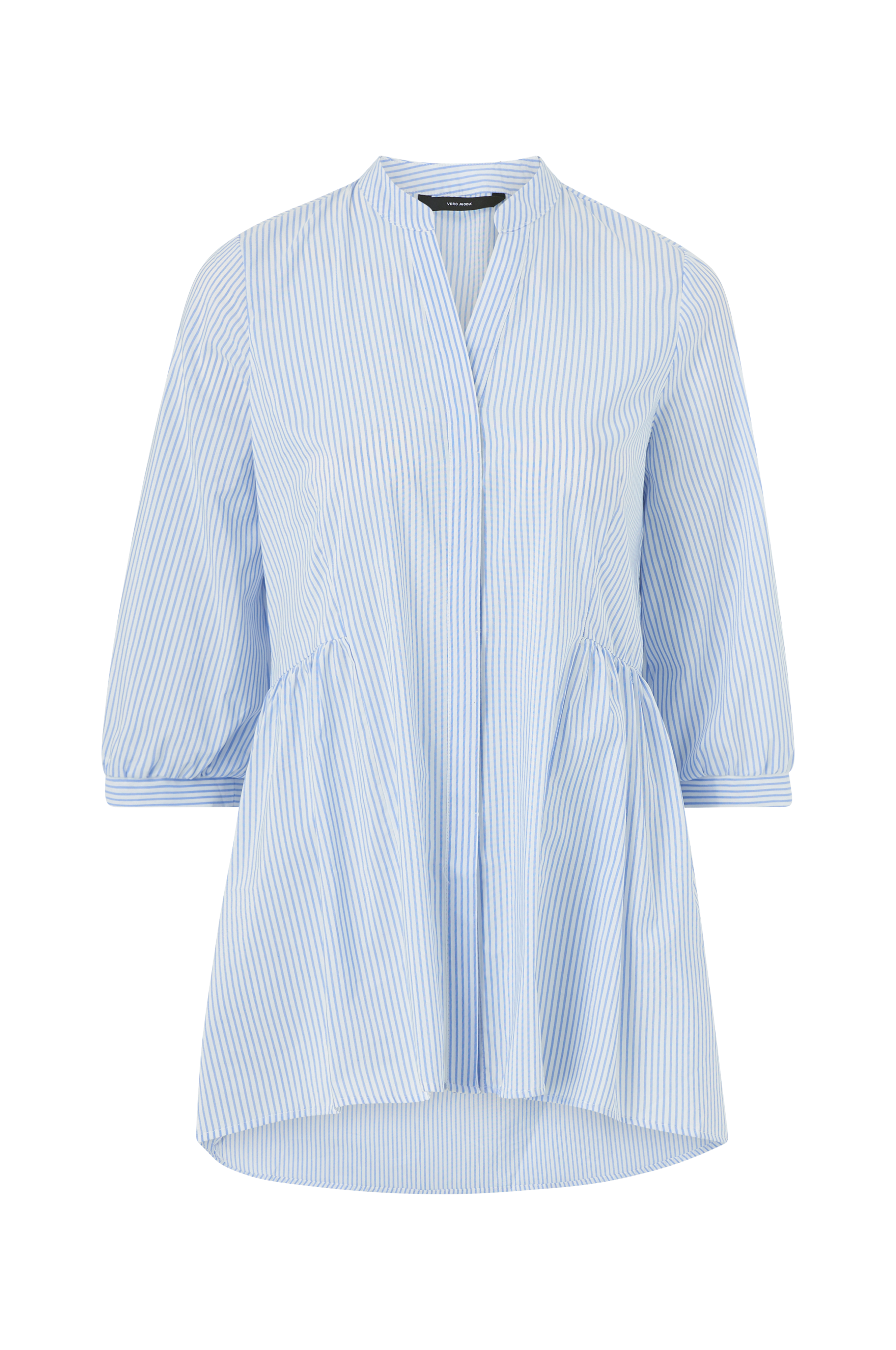 Længere bluse med rynkede sider i taljen og A-formet underdel. Skjulte knapper foran og 3/4-lange ærmer med smal manchet. Blusen er noget længere bagpå.