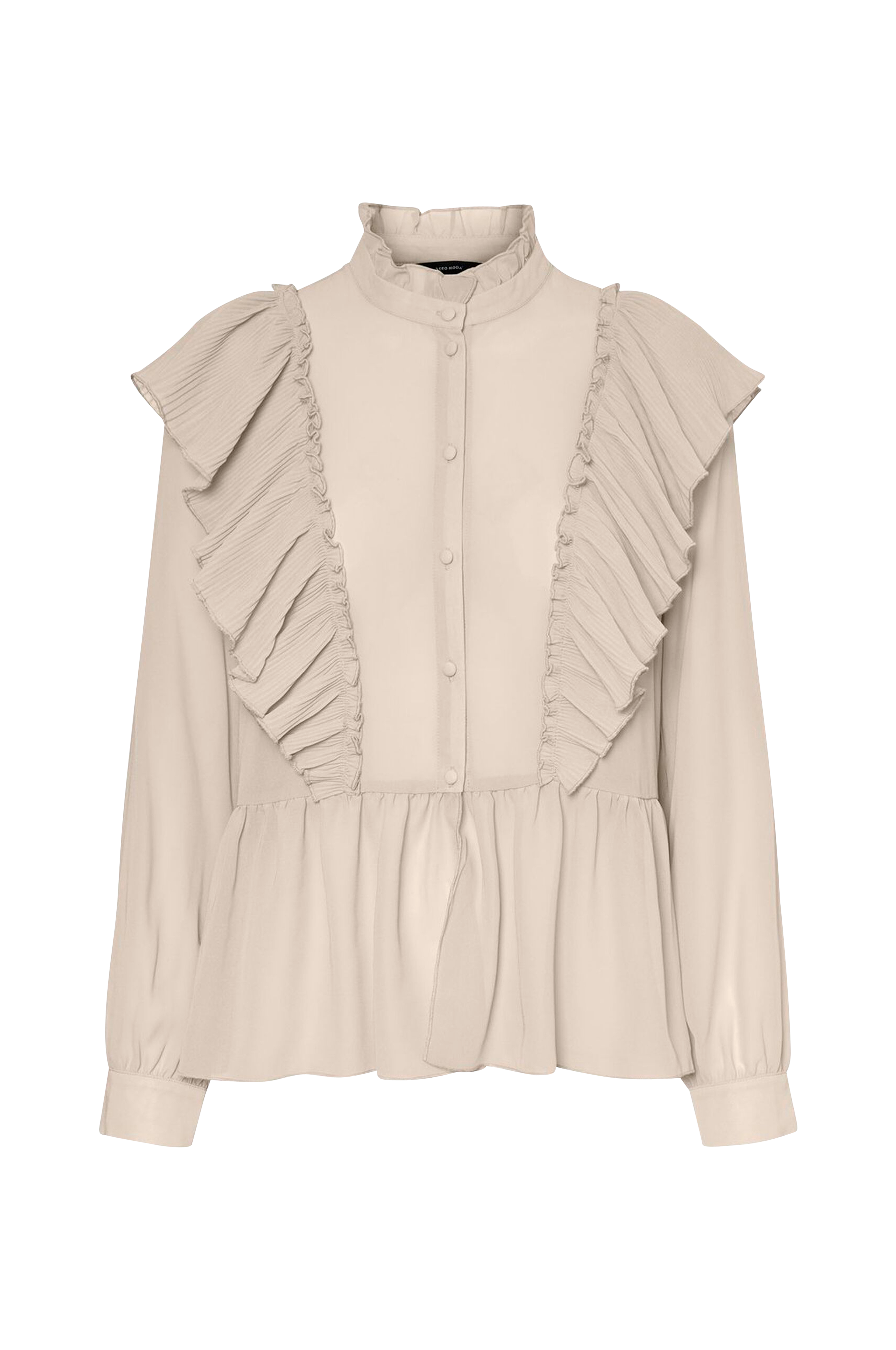 Bluse vmIris LS Frill Shirt fra Vero Moda. Model i vævet chiffon med smalplisserede flæser foran og bagpå samt over skuldrene. Også lille flæse i hals og lukning med betrukne knapper foran. Afskæring i taljen med vidde i forneden og langt ærme med manchet i ærmekant.