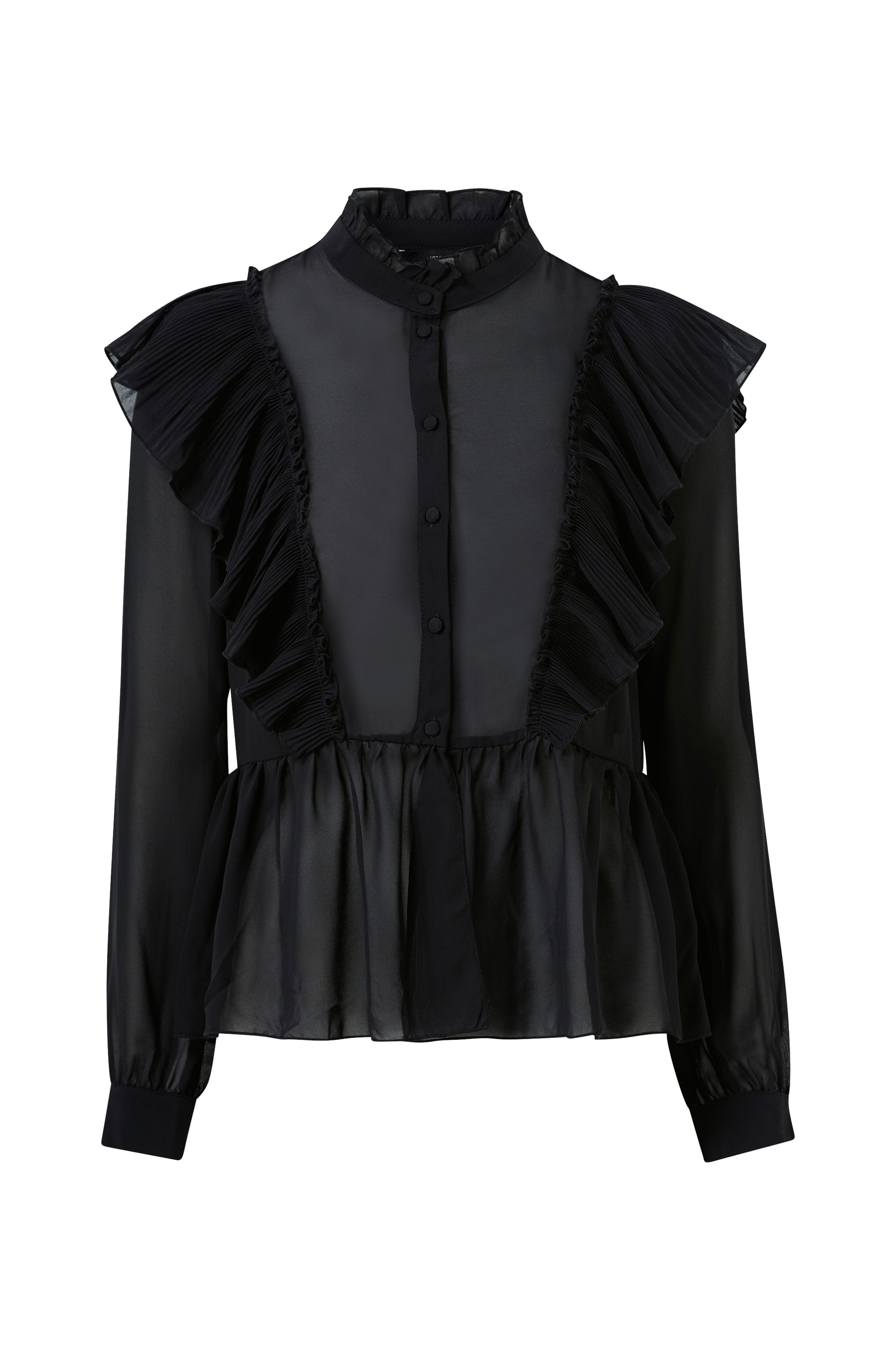 Bluse vmIris LS Frill Shirt fra Vero Moda. Model i vævet chiffon med smalplisserede flæser foran og bagpå samt over skuldrene. Også lille flæse i hals og lukning med betrukne knapper foran. Afskæring i taljen med vidde i forneden og langt ærme med manchet i ærmekant.