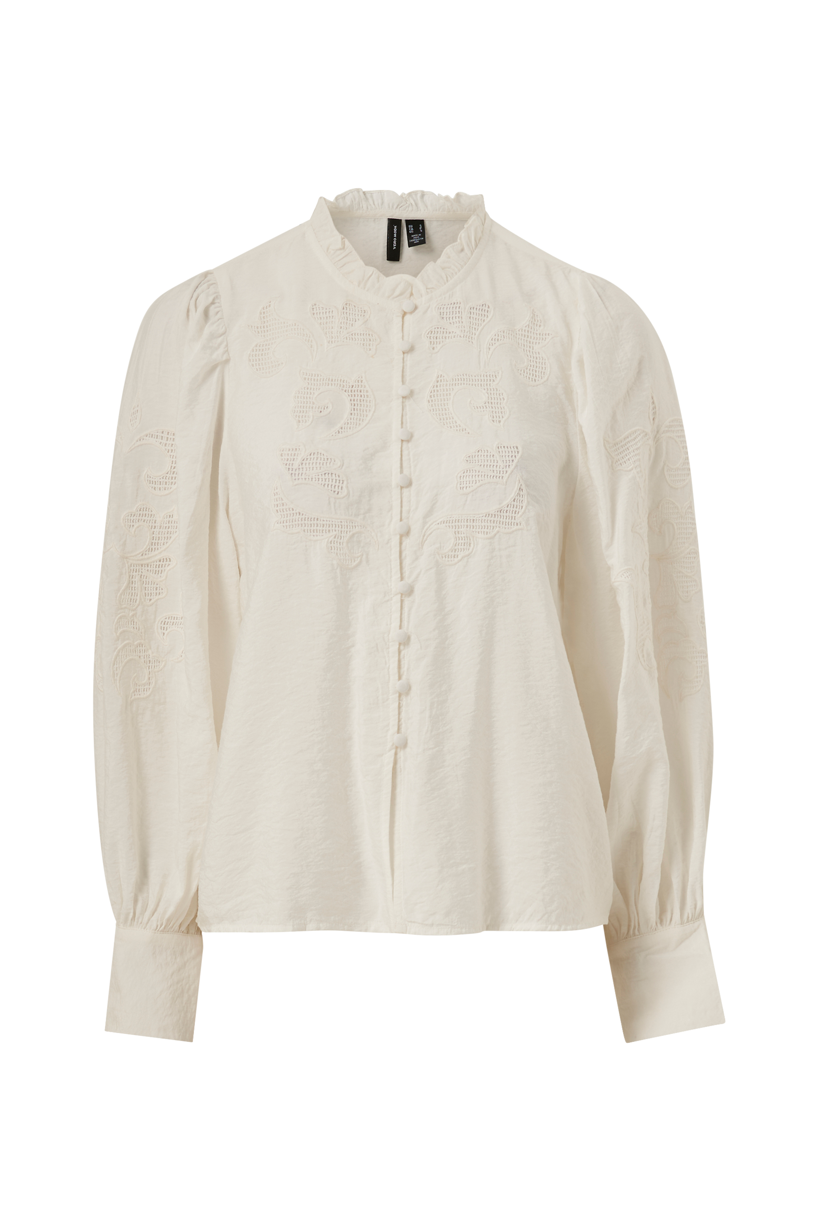 • Knapper foran• Ballonærmer med manchet• Volant i halsen• Broderet hulmønster foran og på ærmerne