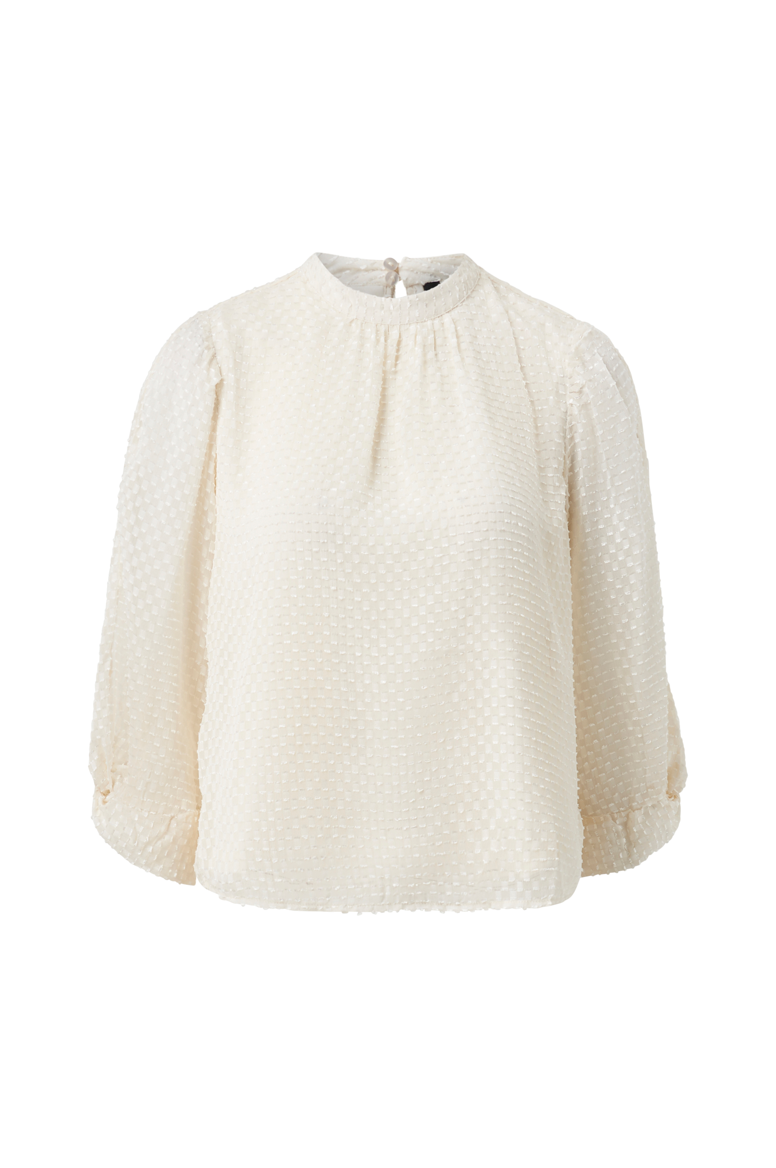 • Bluse i chiffon med vævet strukturmønster• Rund hals med samling foran og ventilation med knapper bagpå• 3/4 lange ærmer med knudedetalje ved ærmeafslutningerne• Trikotfor