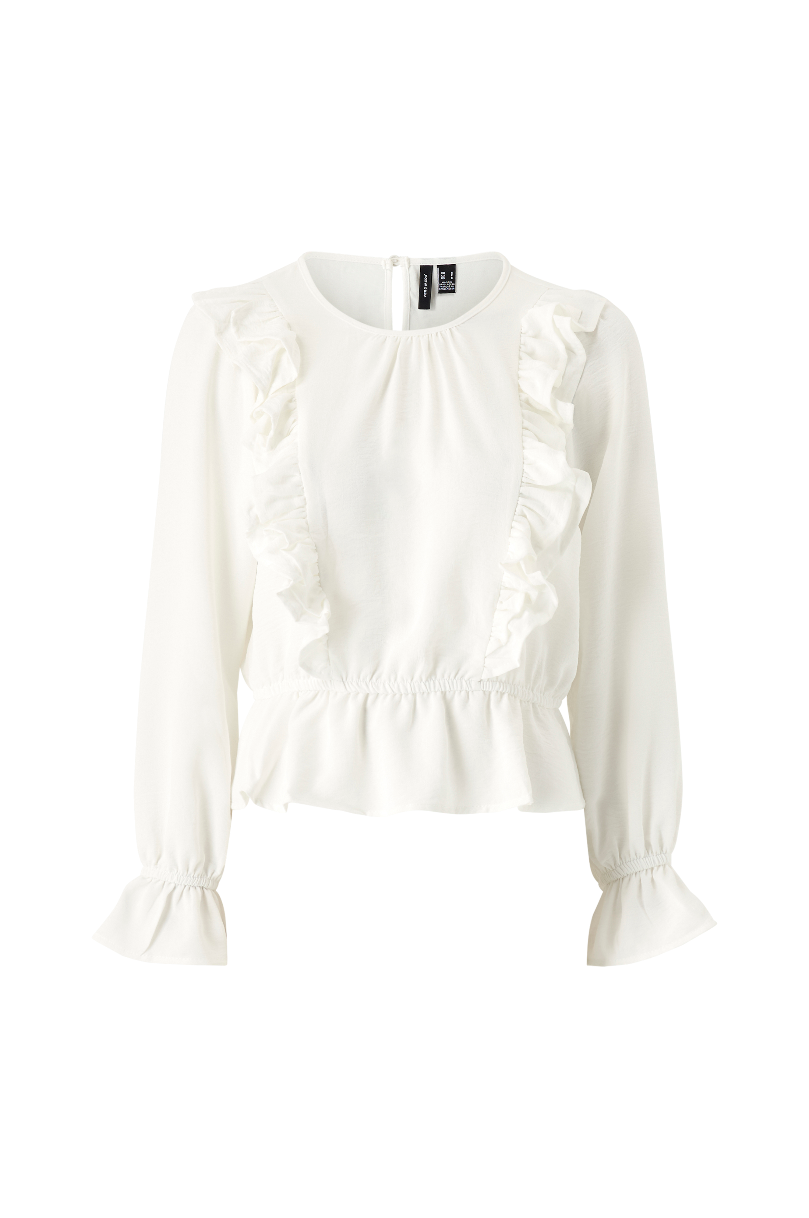 • Volanter foran • Rund hals med samling foran og ventilation bagpå • Elastiske ærmeafslutninger med volant • Elastisk bånd ved taljen • Produktet indeholder genindvundet materiale, som genbruges for at reducere mængden af affald samtidigt med at der ikke anvendes nye ressourcer.