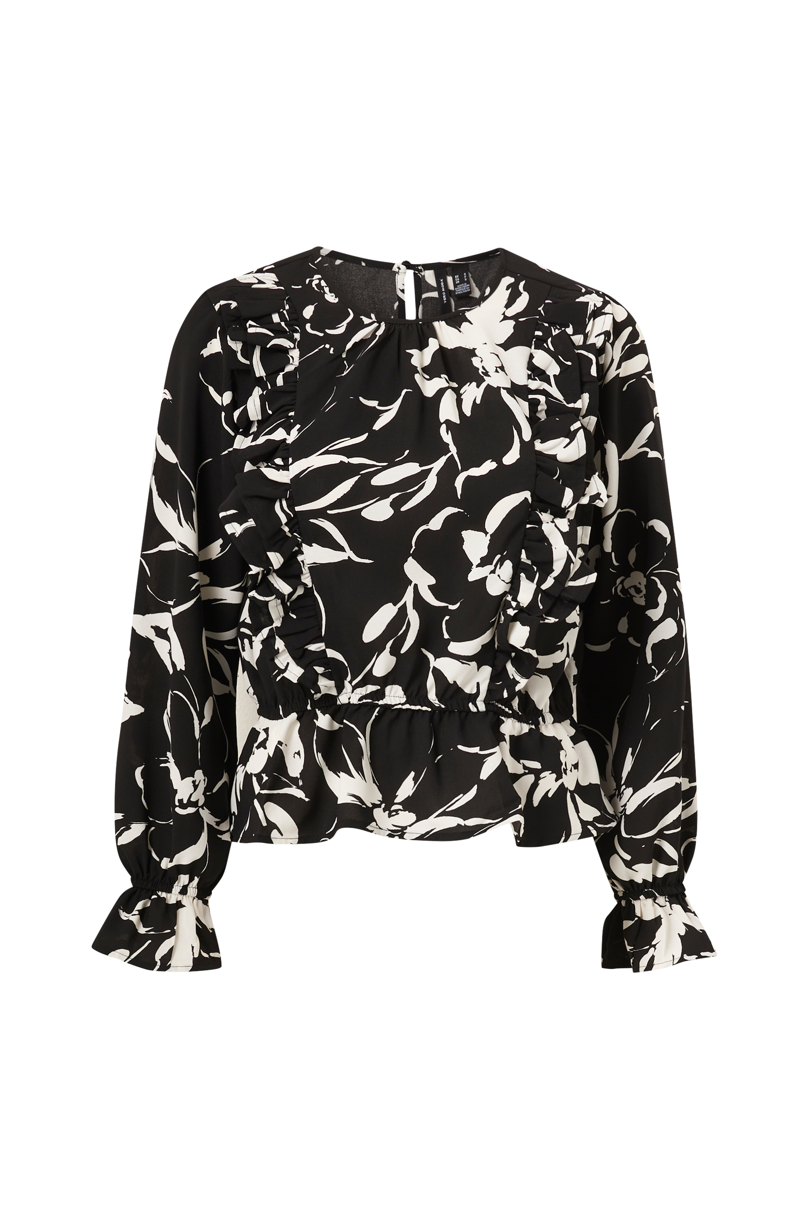 • Volanter foran • Rund hals med samling foran og ventilation bagpå • Elastiske ærmeafslutninger med volant • Elastisk bånd ved taljen • Produktet indeholder genindvundet materiale, som genbruges for at reducere mængden af affald samtidigt med at der ikke anvendes nye ressourcer.