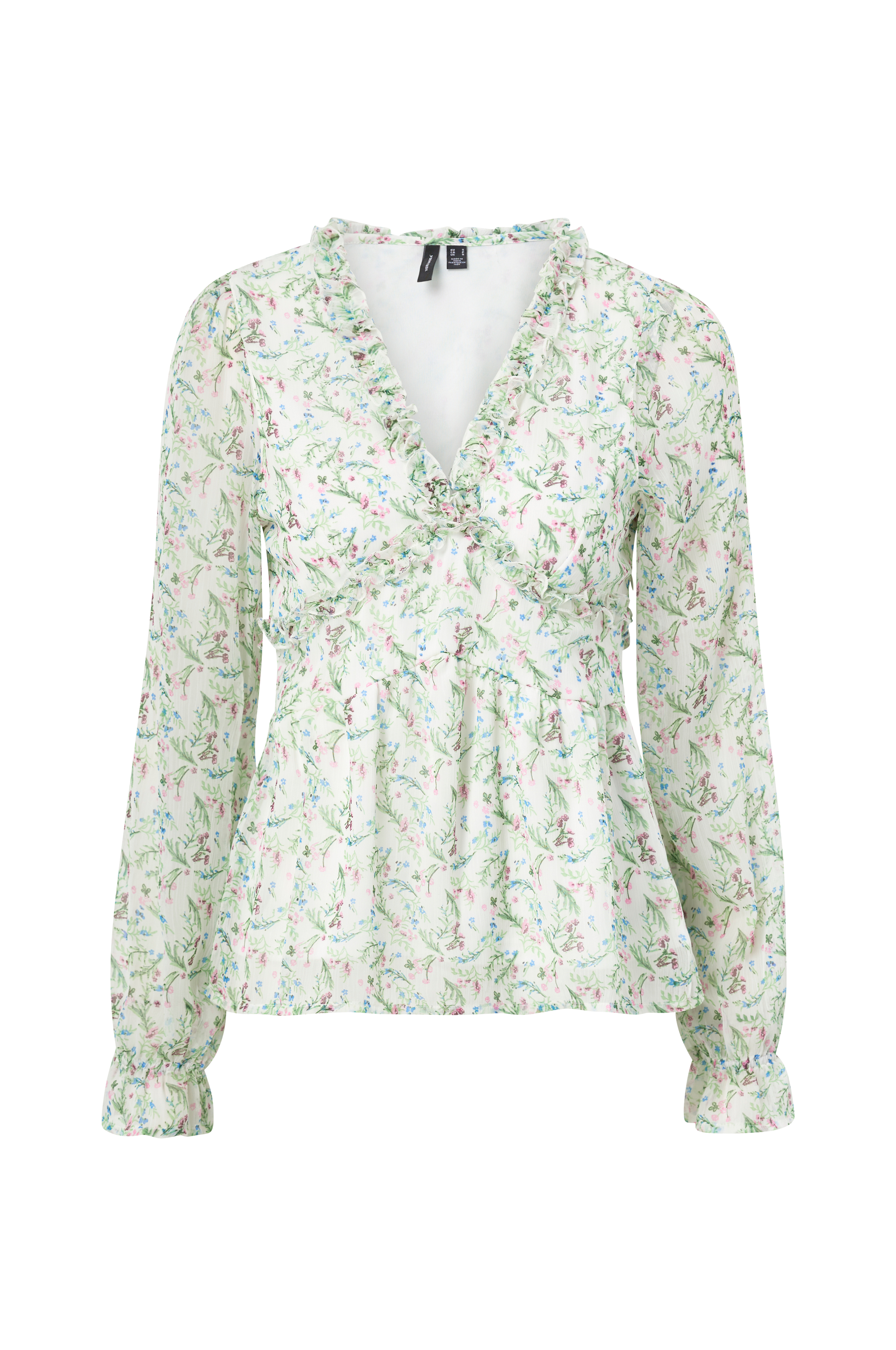 • V-udskæring med volant • Lange, transparente ærmer med volant ved manchetterne • Defineret talje med samling • Fremstillet af chiffon • Trikotfor • Produktet indeholder genindvundet materiale, som genbruges for at reducere mængden af affald samtidigt med at der ikke anvendes nye ressourcer.