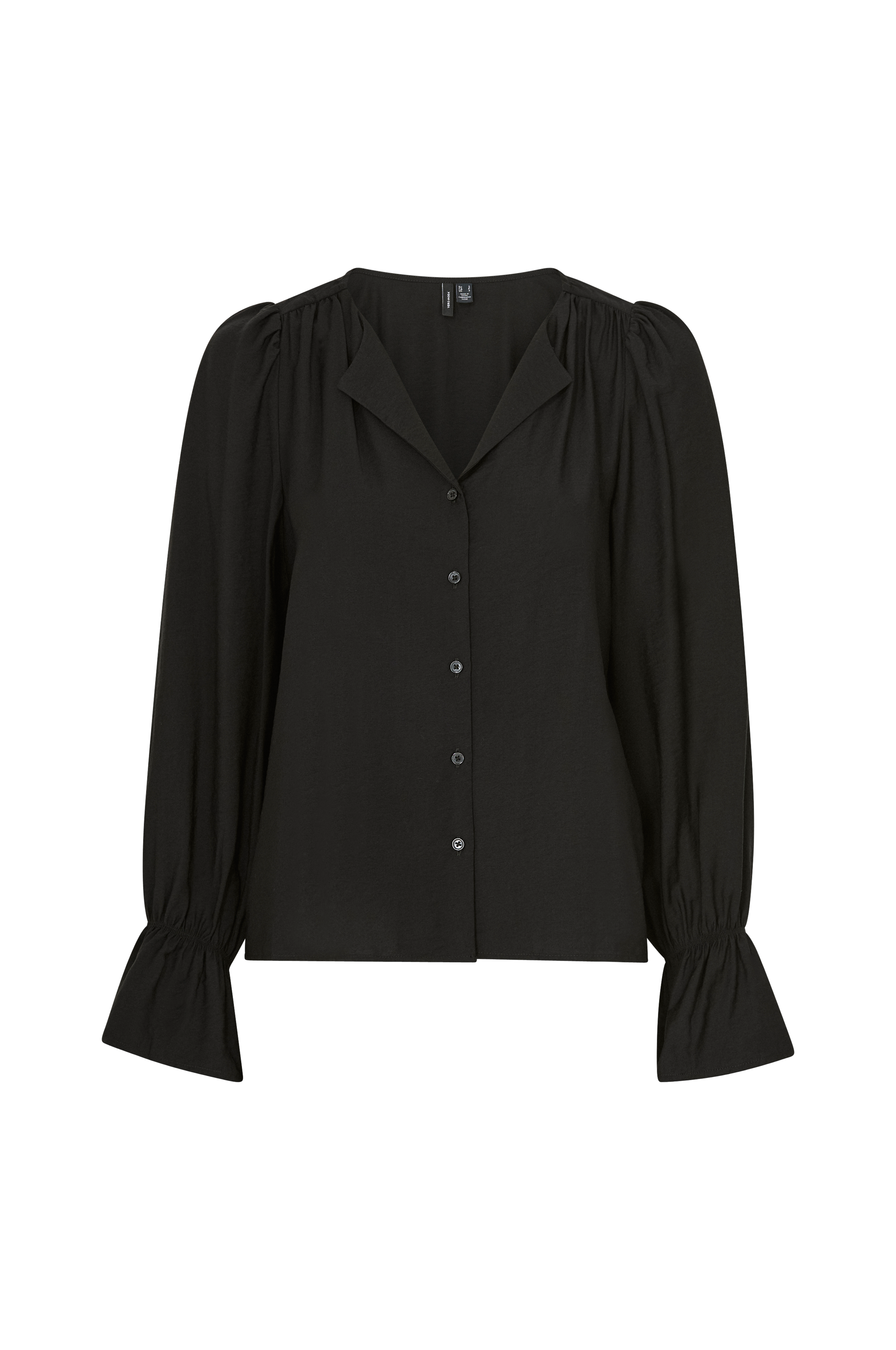 • Knapper foran• V-udskæring med revers• Rynket søm på skuldrene• Lange ballonærmer med elastisk bånd og volant ved manchetterne• Kvalitet med struktur