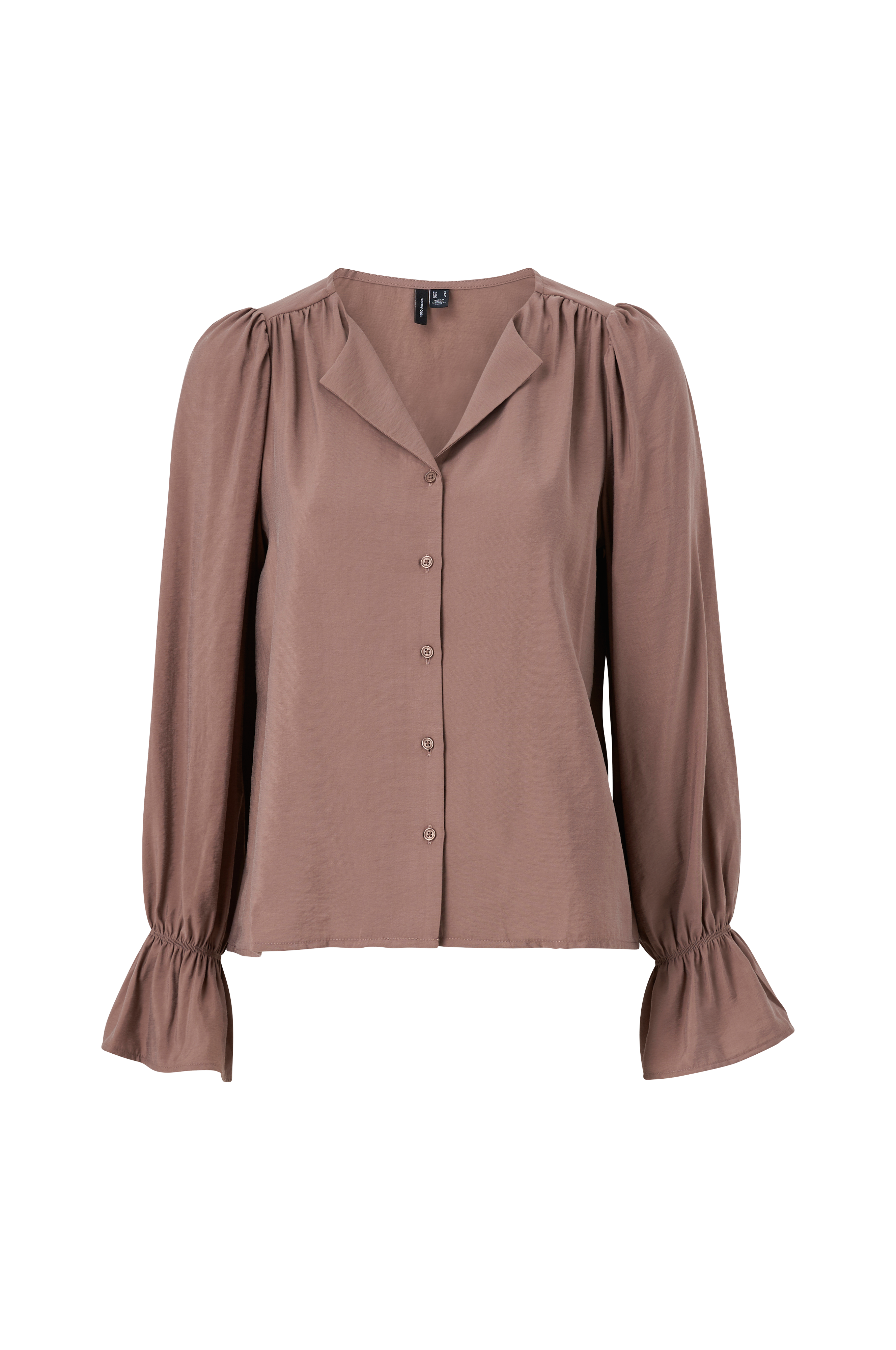 • Knapper foran• V-udskæring med revers• Rynket søm på skuldrene• Lange ballonærmer med elastisk bånd og volant ved manchetterne• Kvalitet med struktur