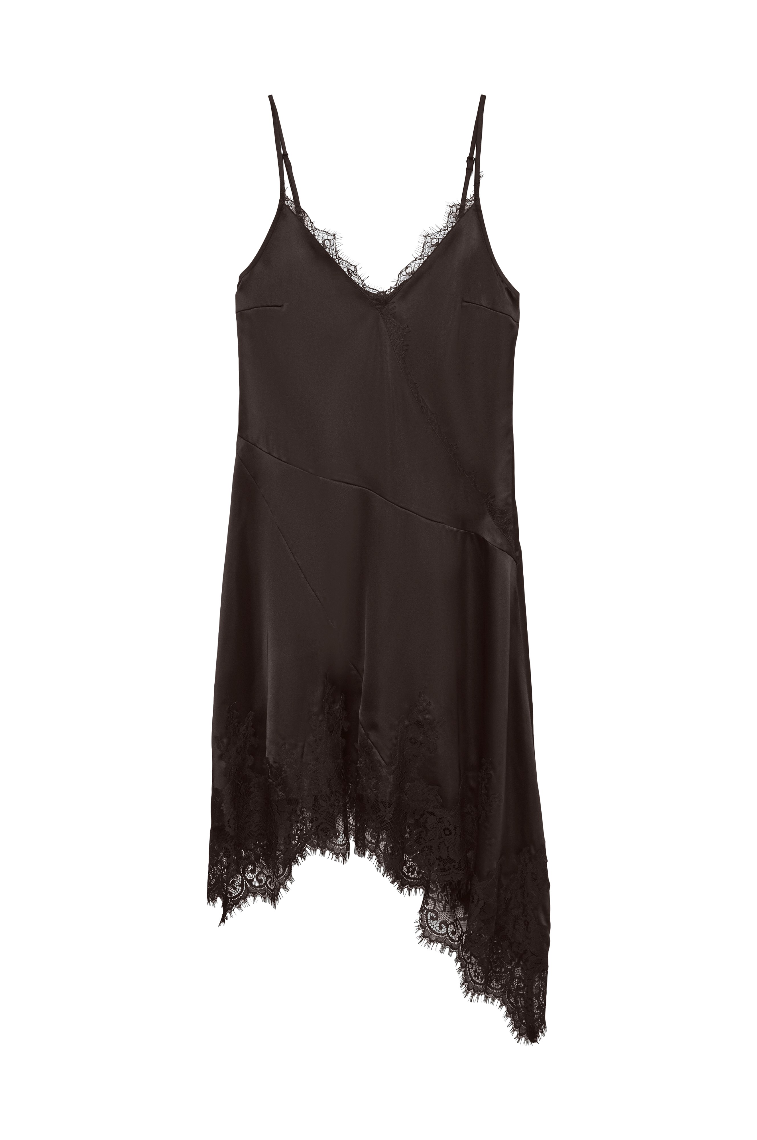 • Camisole i satin med asymmetrisk design• Dekorative blondedetaljer rundt om halsudskæringen, under brystet og ved nederste kant• V-formet halsudskæring• Tynde, justérbare skulderstropper• Løs pasform