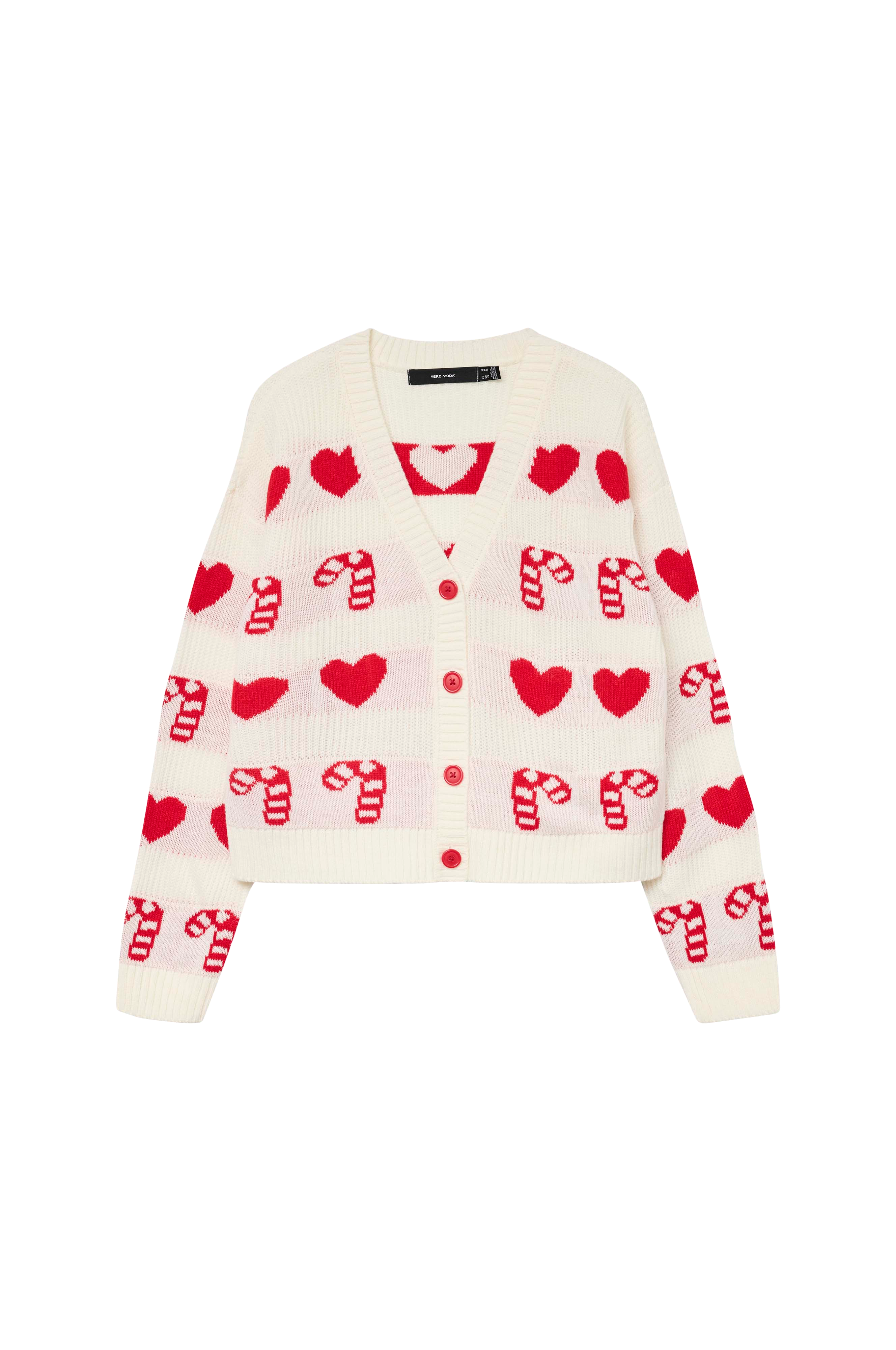 • Strikket, langærmet cardigan med julemønster• V-formet, ribbet halsudskæring• Knapper foran• Ribmanchetter ved manchetterne og ved nederste kant
