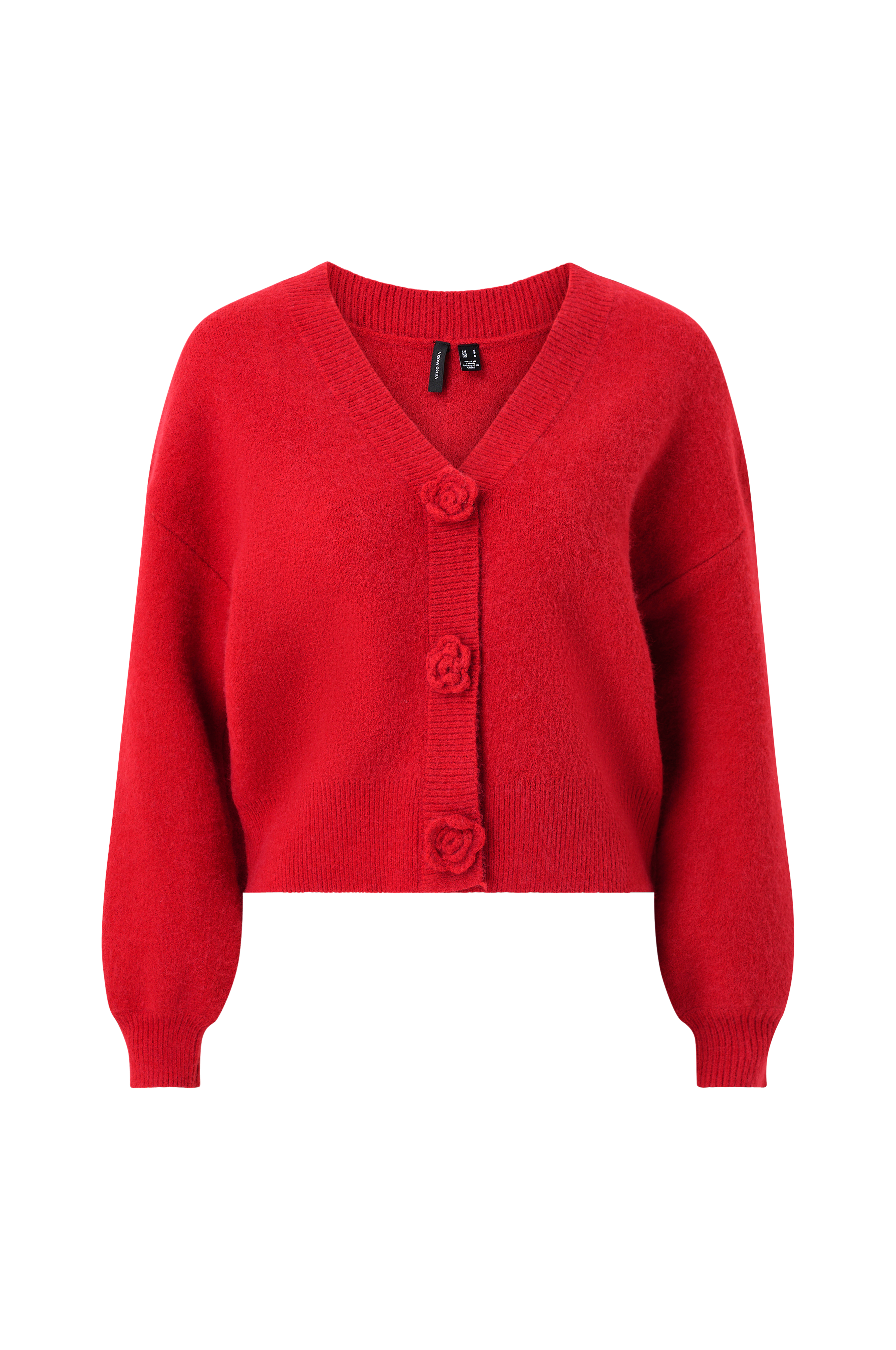 • Blød, fintstrikket cardigan• V-formet halsudskæring med ribstrikket kant• Nedsænket skulder• Lange ærmer med ribmanchetter ved manchetterne• Knaplukning foran med påsyede, dekorative blomster• Ribstrik ved nederste kant
