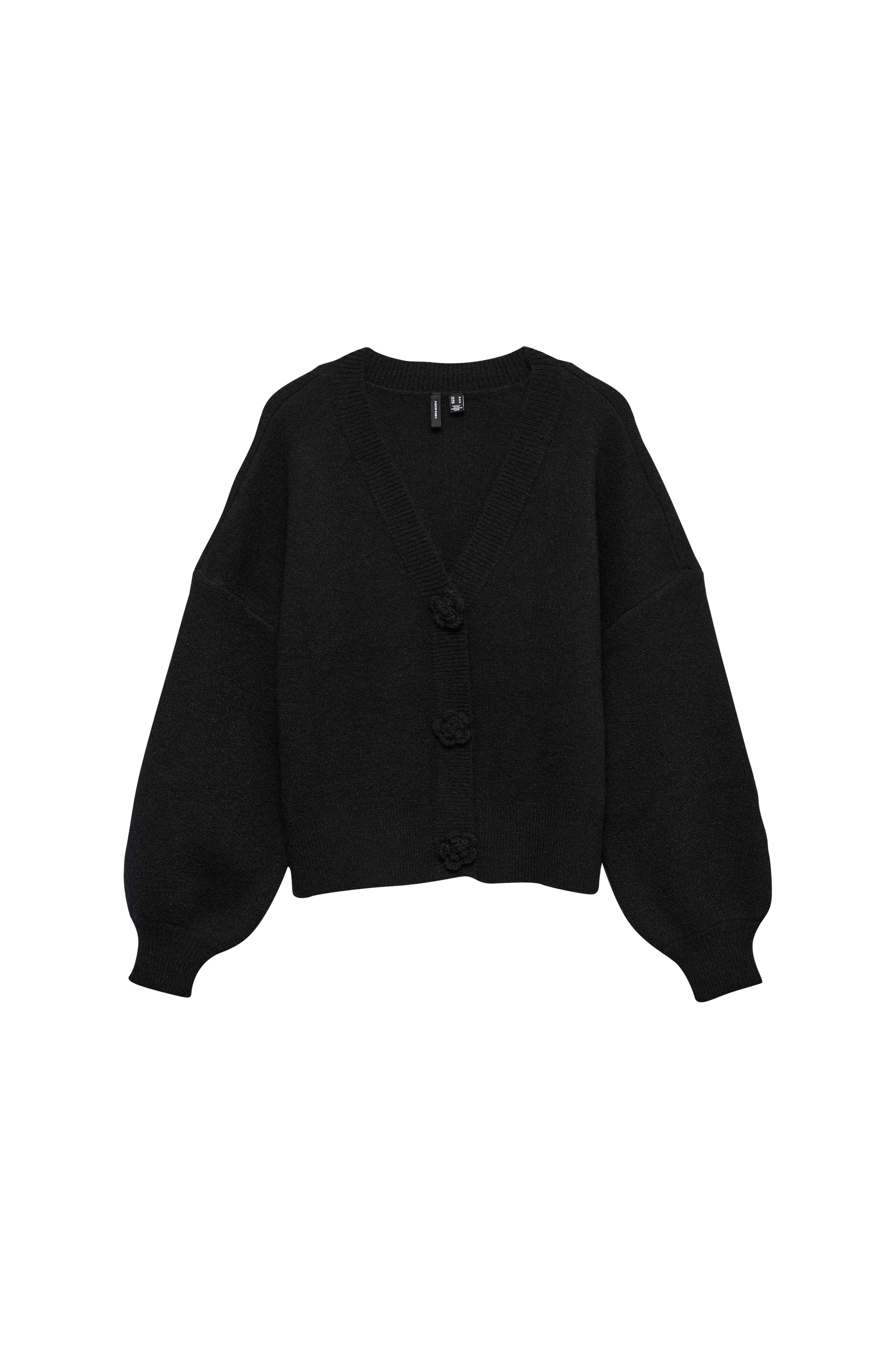 • Blød, fintstrikket cardigan• V-formet halsudskæring med ribstrikket kant• Nedsænket skulder• Lange ærmer med ribmanchetter ved manchetterne• Knaplukning foran med påsyede, dekorative blomster• Ribstrik ved nederste kant