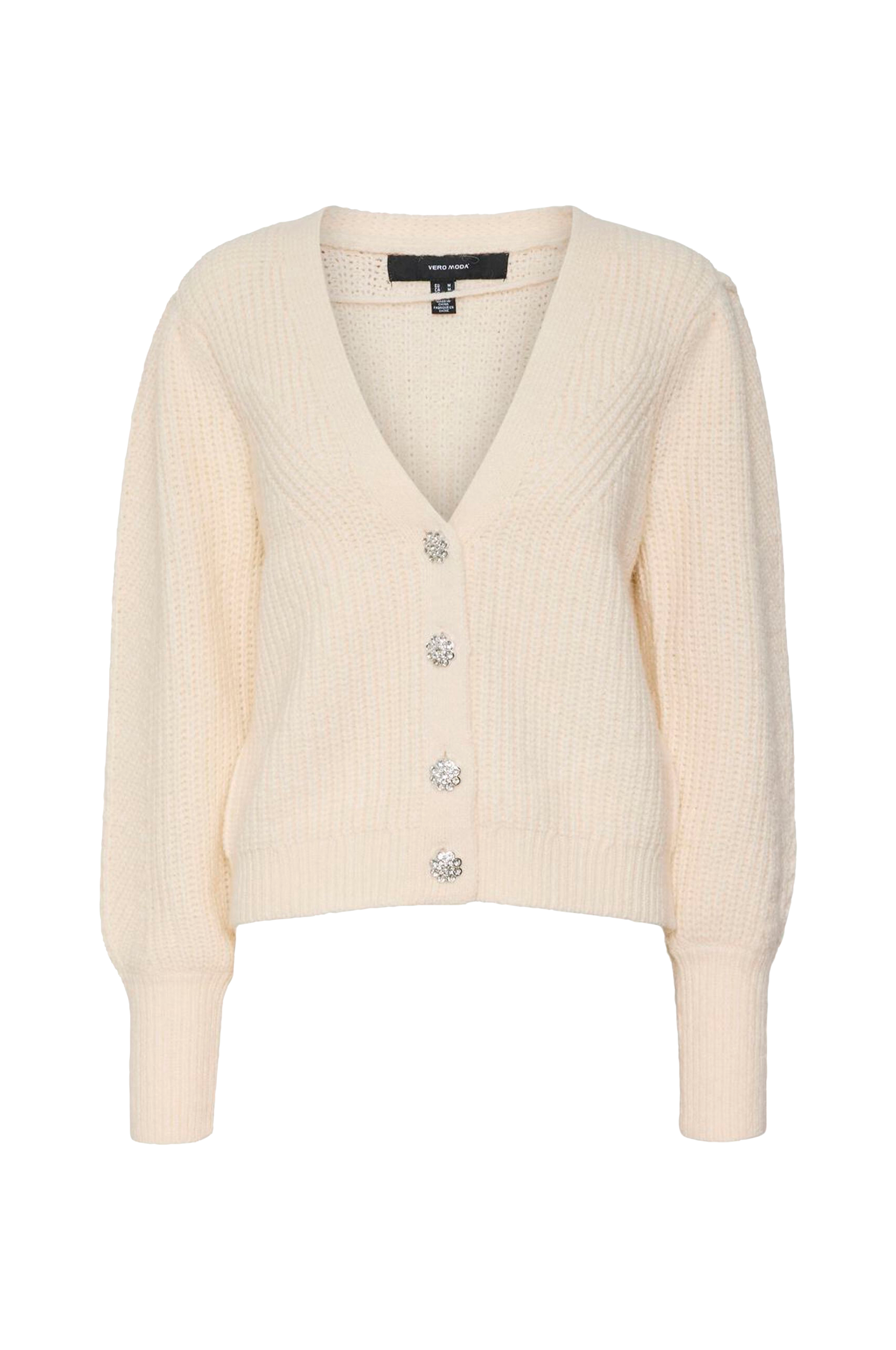 • Grovstrikket cardigan• V-udskæring• Knapper med rhinsten foran• Lægge på skuldrene