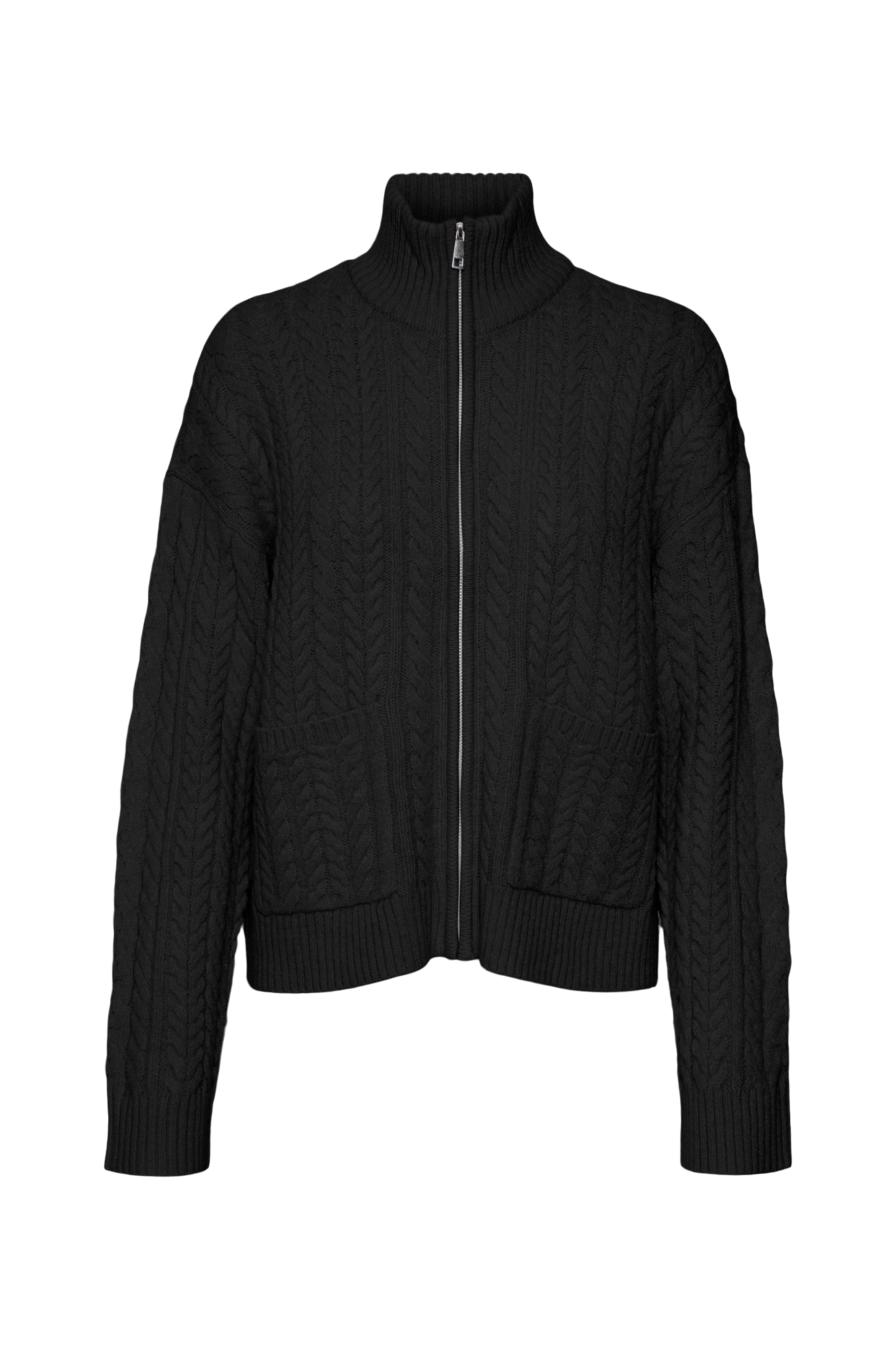 • Kabelstrikket cardigan• Høj, ribbet halsudskæring• Lynlås• To lommer• Ribstrik ved manchetterne og nederst