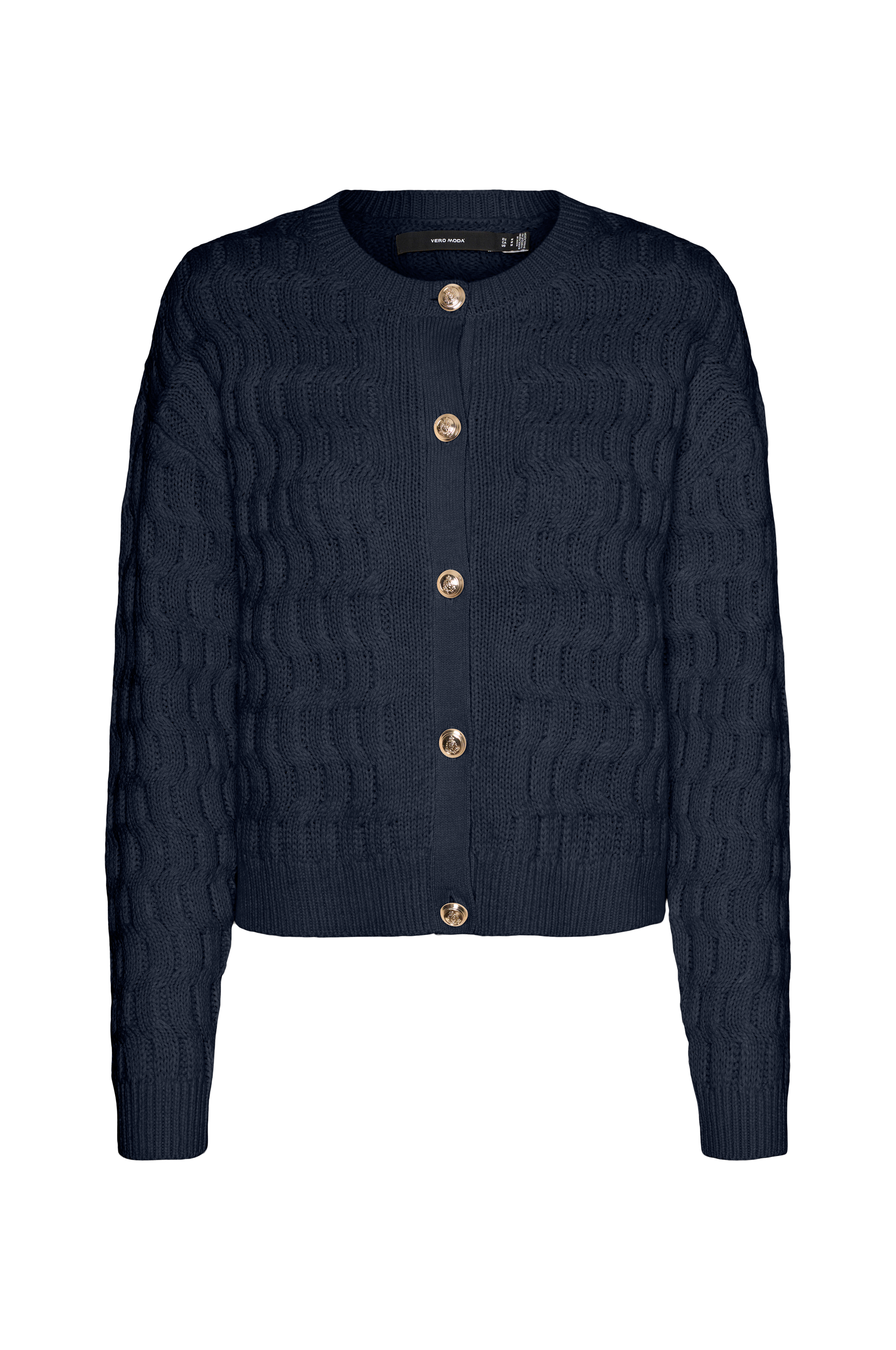 • Strukturstrikket cardigan med lange arme• Ribstrik ved manchetterne og nederst• Knapstolpe med guldfarvede, dekorative knapper foran• Afrundet, ribstrikket halsudskæring
