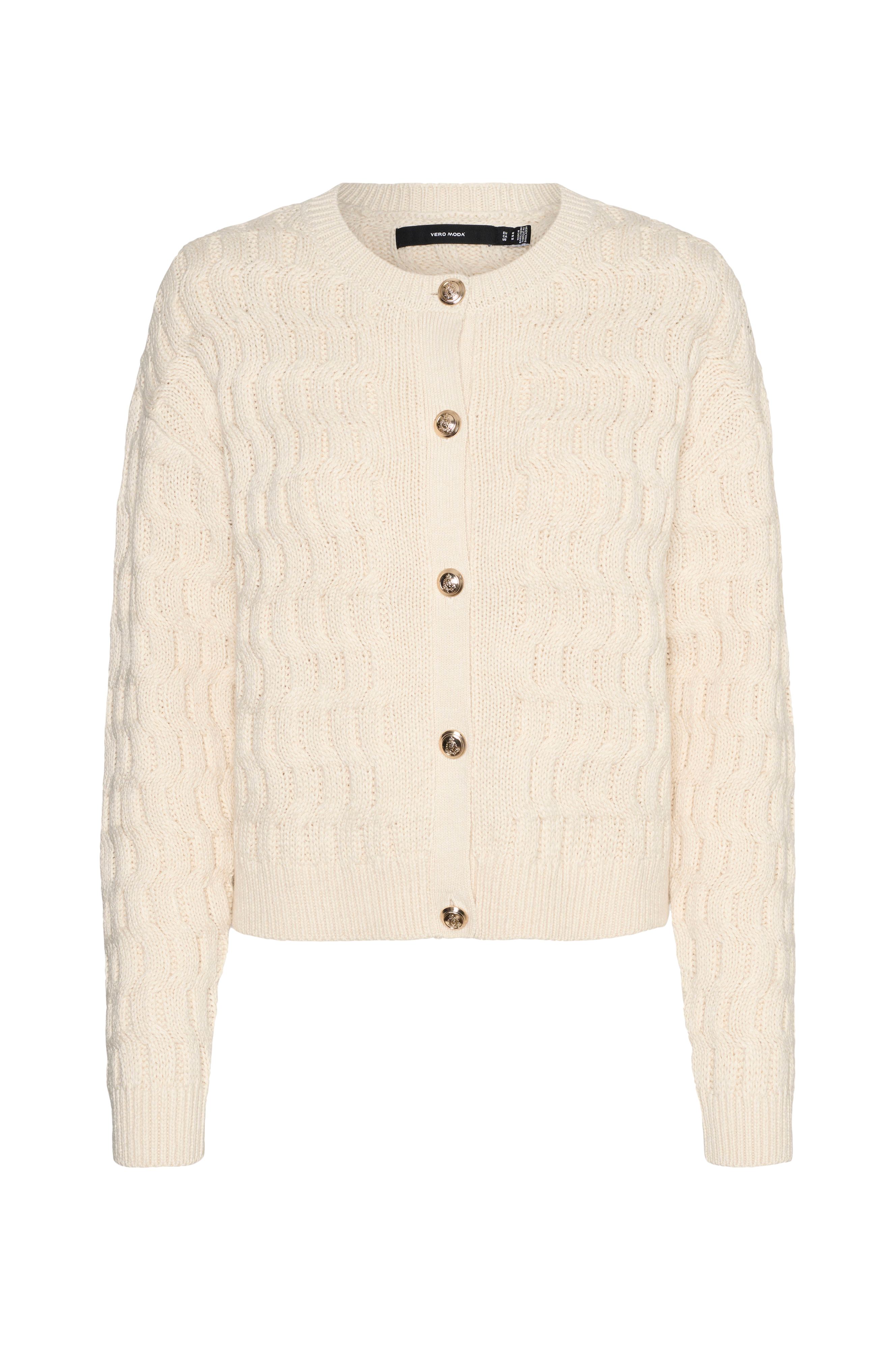 • Strukturstrikket cardigan med lange arme• Ribstrik ved manchetterne og nederst• Knapstolpe med guldfarvede, dekorative knapper foran• Afrundet, ribstrikket halsudskæring