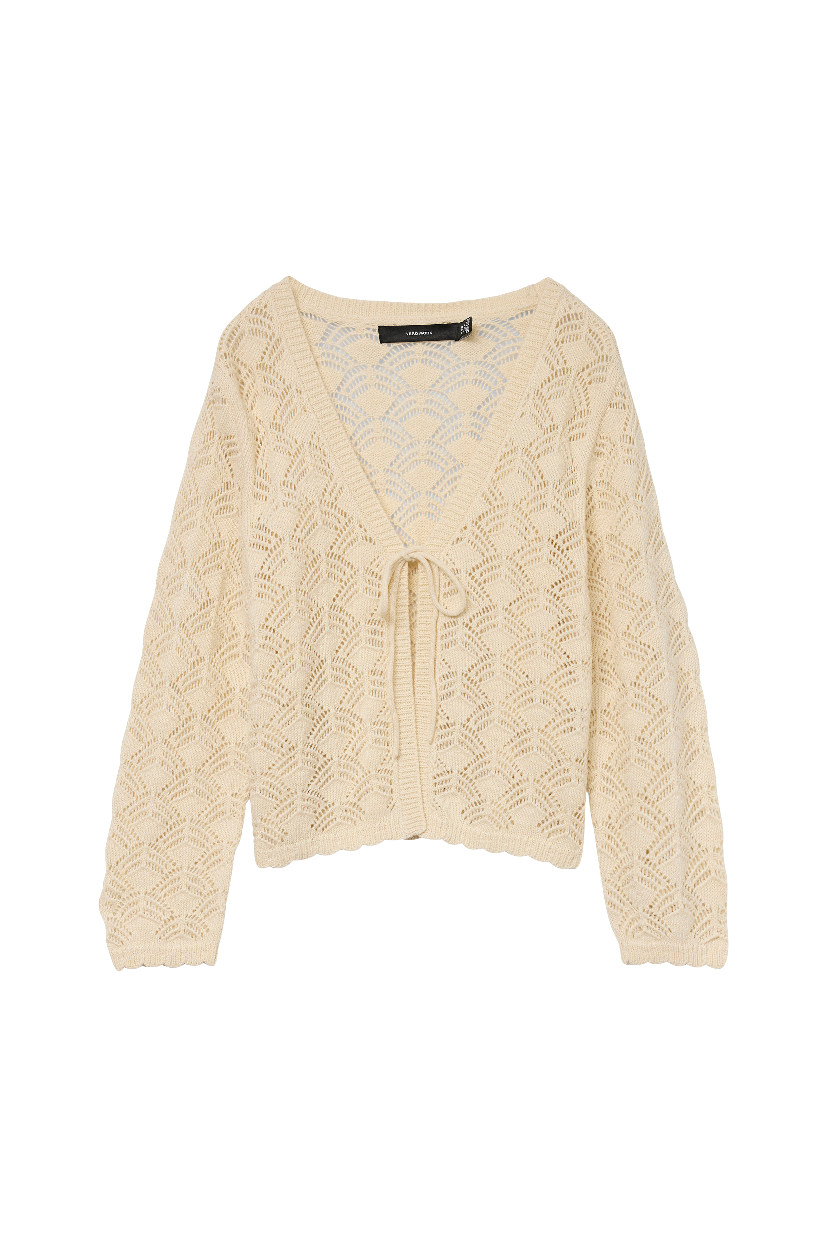 • Mønsterstrikket, kort cardigan med hulmønster• V-udskæring• Lukning med bindebånd• Ribstrikkede detaljer