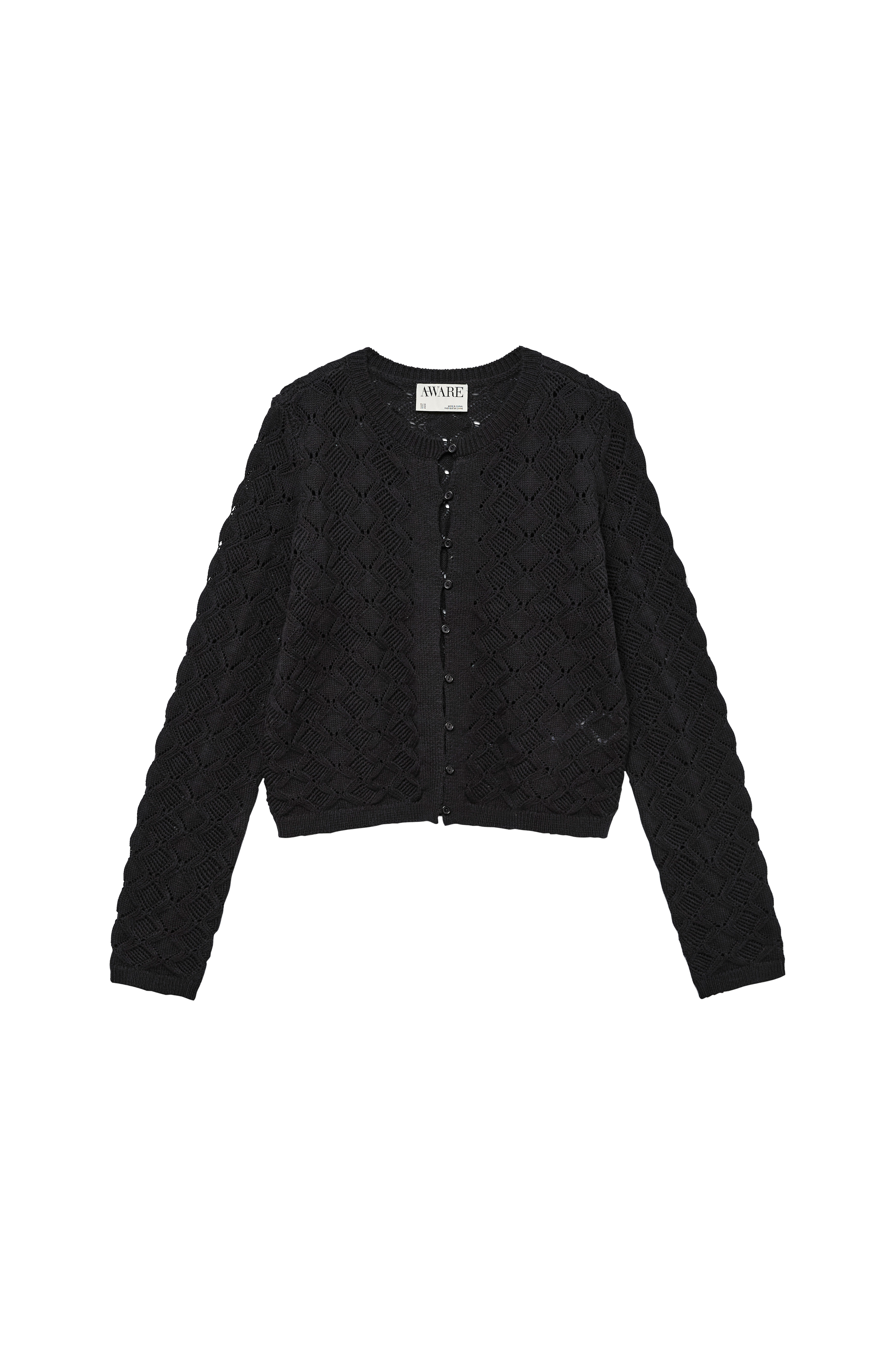 • Cardigan i blød, mønsterstrikket bomuldsblanding• Lange ærmer• Knapstolpe foran med små knapper• Smal ribbet kant ved ærmeafslutningerne, nederst og i halsen• Rund halsringning