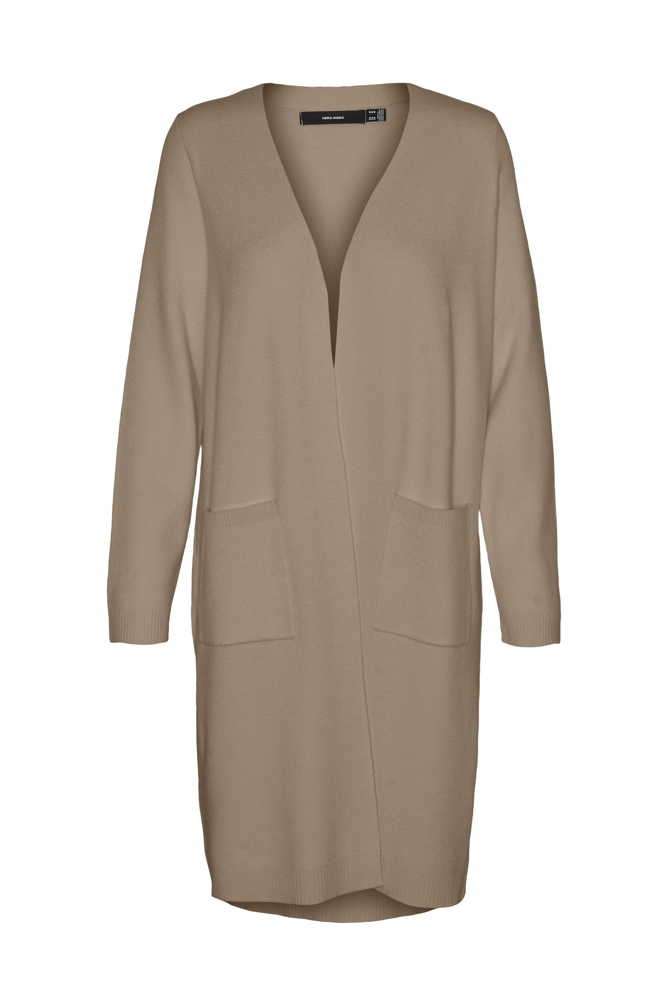 • Lang model• Ærme med ribstrikket kant nederst• Lommer• Ribstrik ved nederste kant•