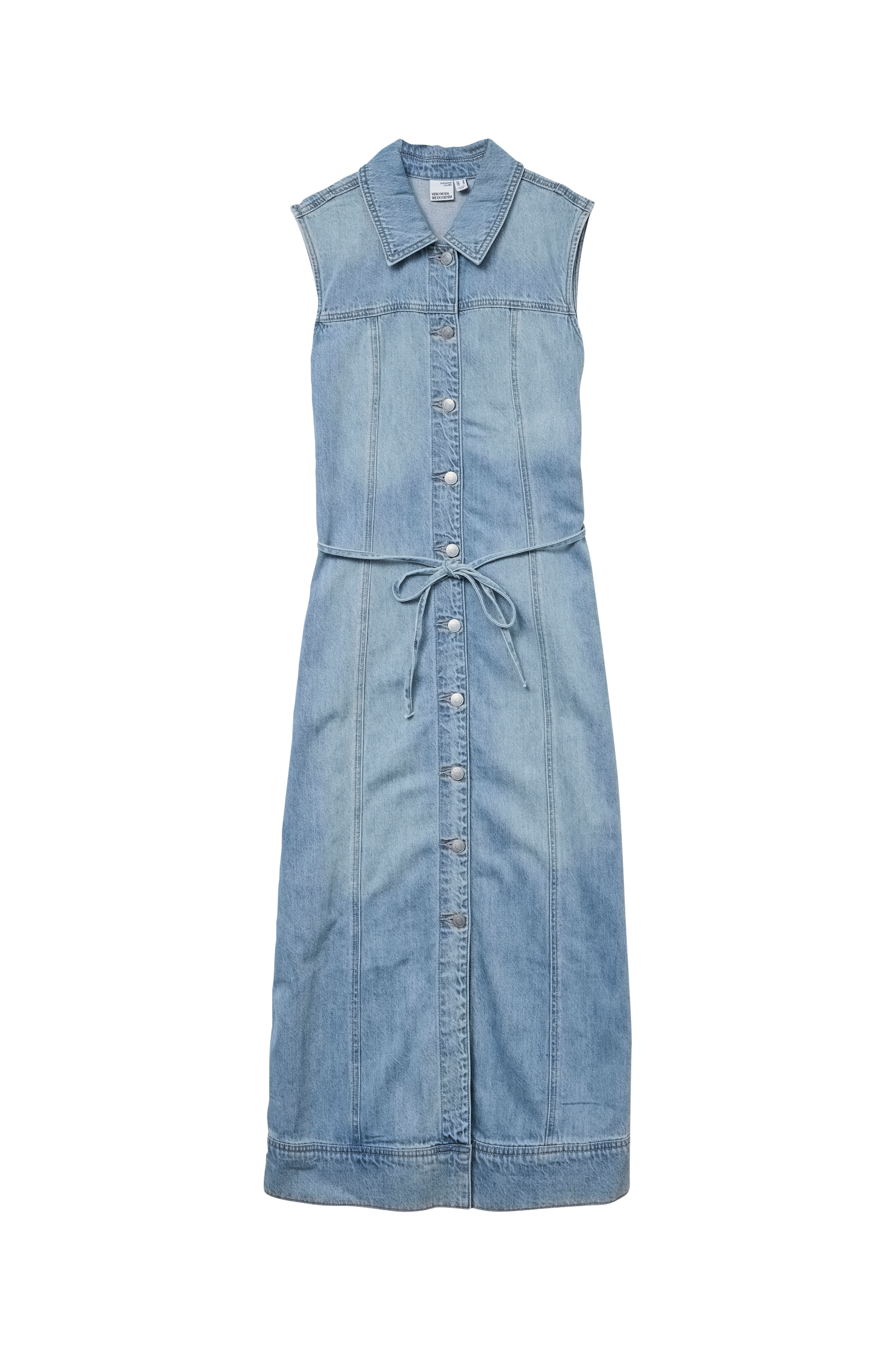 • Kjole i bomuldsdenim• Ærmeløst design• Skjortekrave• Knapstolpe hele vejen frem• Bindebælte ved taljen• Panelsømme foran og bagpå• Normal pasform• Længde: 119 cm i størrelse XS