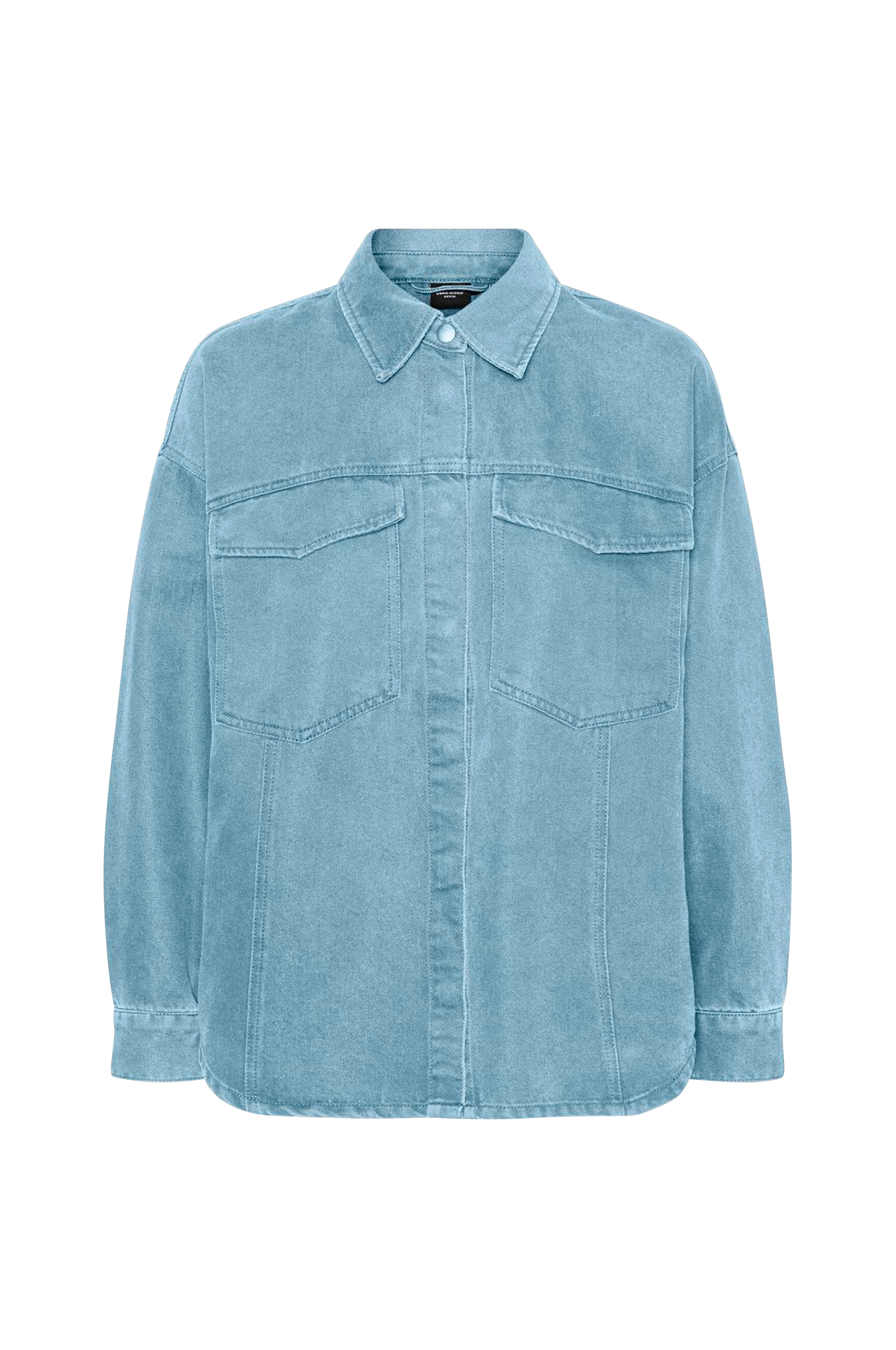 • Skjulte trykknapper foran• To brystlommer• Nedsænkede skuldre• Løs pasform• Fremstillet af denim