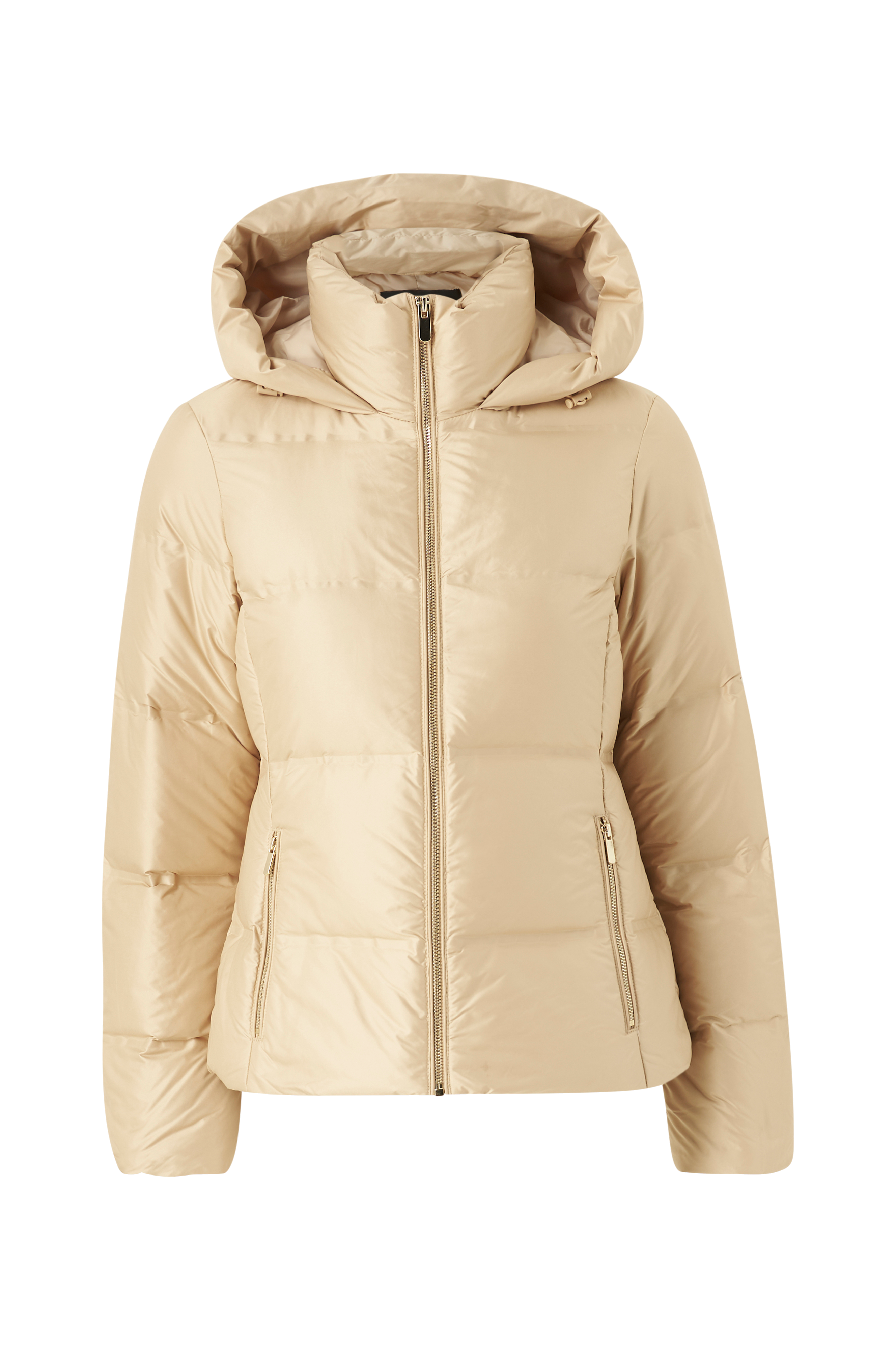 • Kort jakke med fyld i dun- og fjerblanding• Fast hætte med træksnørre• Lynlås• To lommer med lynlås• Elastik ved manchetterne• Længde: 58 cm i størrelse S
