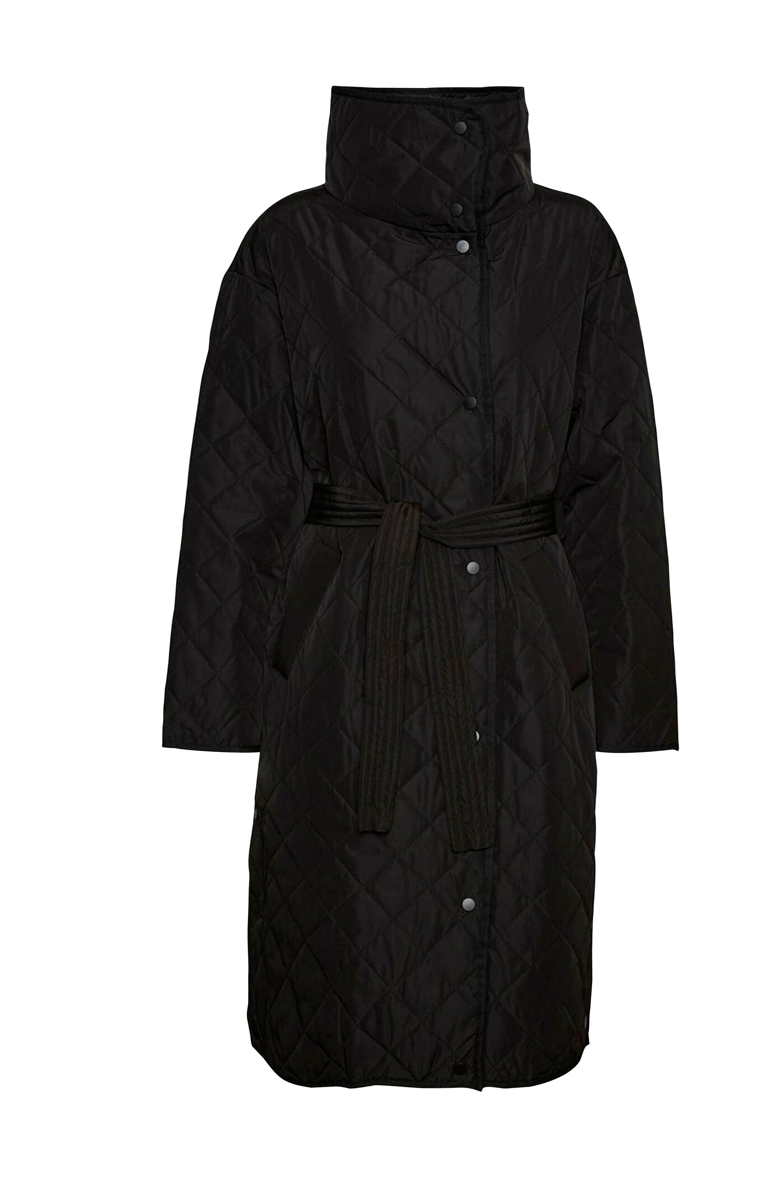 • Quiltet model med tynd polstring• Høj ståkrave• Lommer foran• Bindebælte ved taljen• Trykknapper foran og nede i siderne• Længde: 105 cm i størrelse S