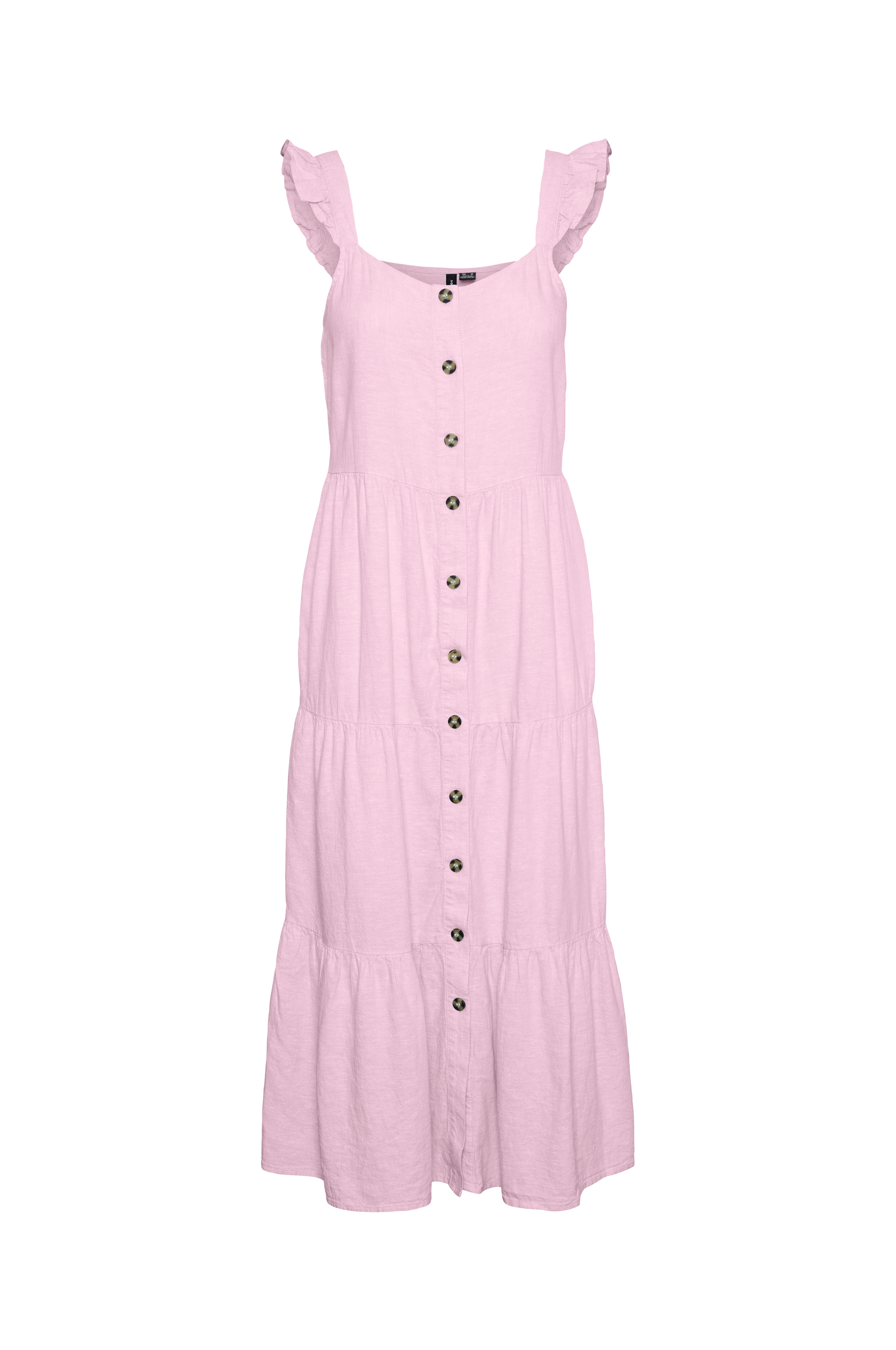 • Ærmeløs model med svaj• Brede skulderstropper med lille volant• Knapper hele vejen frem• Markeret talje• Bred volant ved nederste kant• Længde: 112 cm i størrelse XS