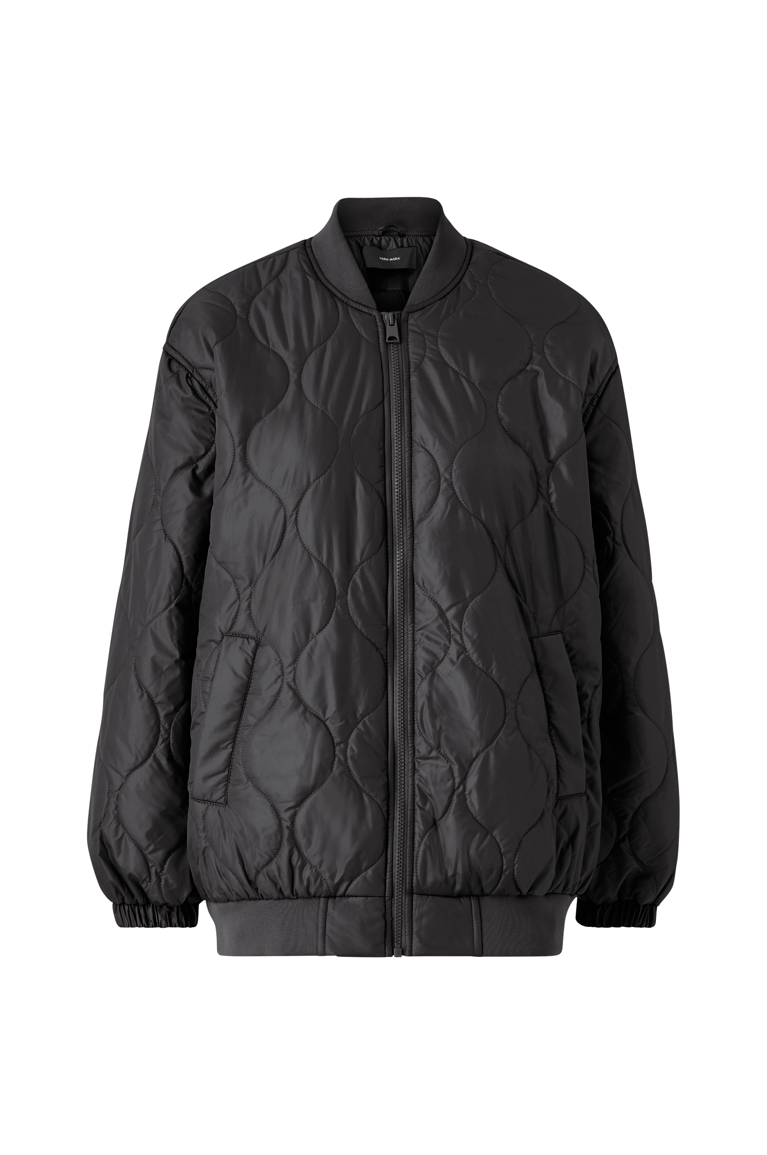 Quiltet og let vatteret jakke med ribstrikket krave. Lynlås og to lommer. Elastik i ærmekanten og ribkant i kanten forneden. Længde ca. 70 cm i str. S.