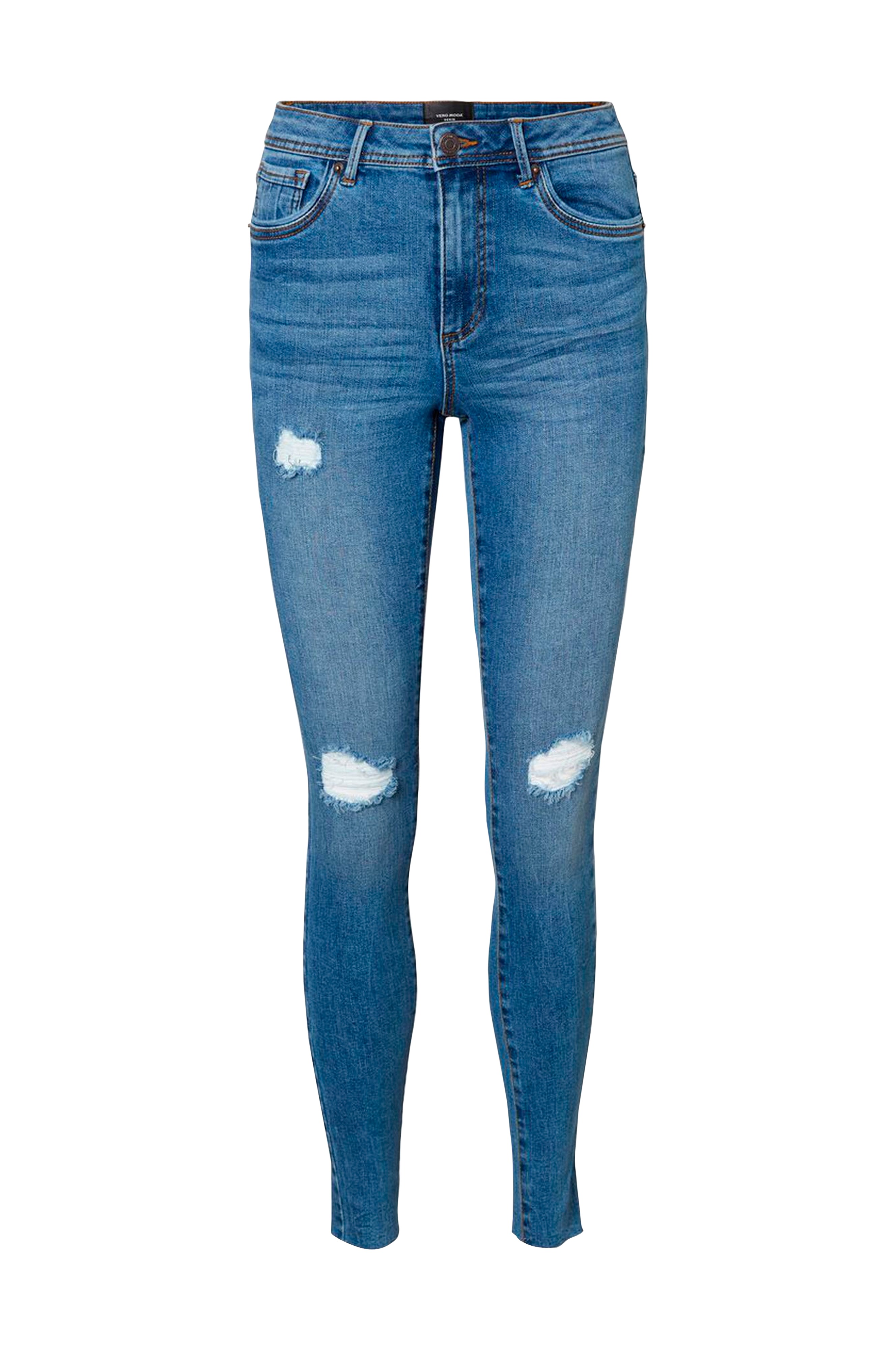 Jeans vmTanya Mr S Piping Dst Raw J VI349 fra Vero Moda i smal model med afklippet, rå benkant og slidte effekter foran. Fem lommer og lynlåsgylp.