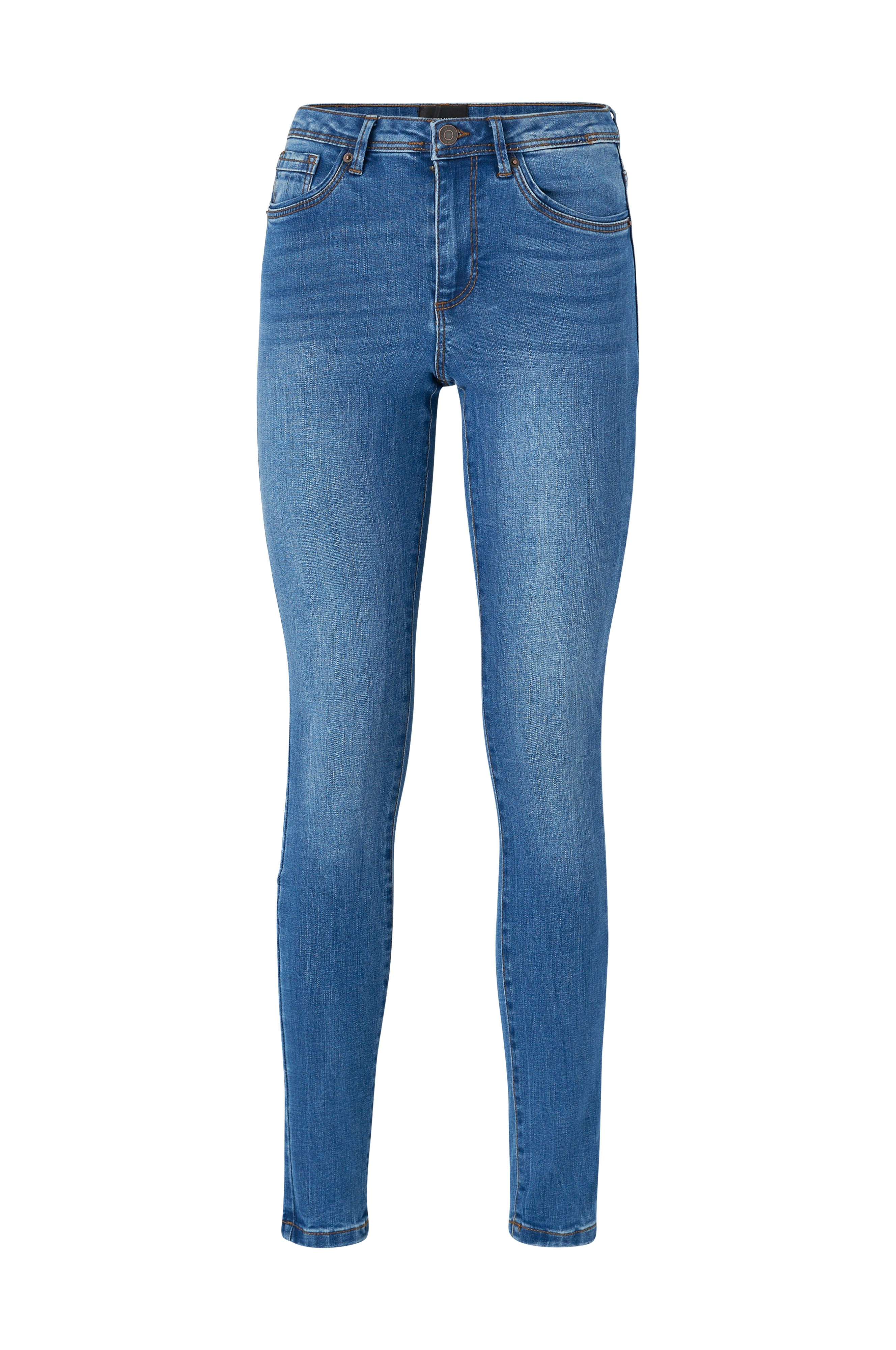 Jeans vmTanya MR S Piping fra Vero Moda. Smal model i stretchdenim med smalle ben. Pyntestukne lommer foran og lynlås i gylpen samt to påsyede baglommer.